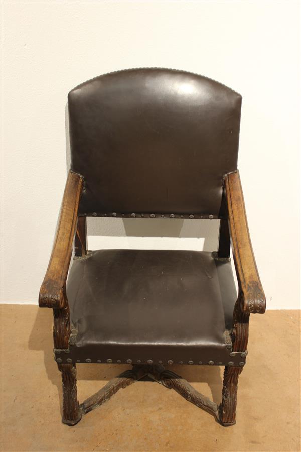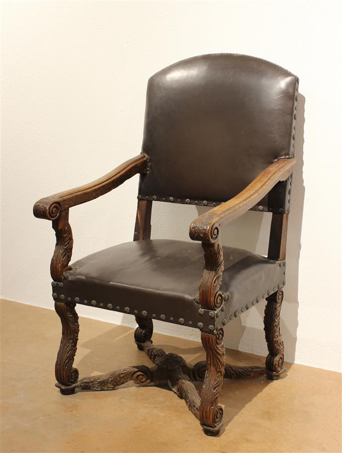 Fauteuil style Louis XIV à dossier plat arrondi, montants en noyer sculpté, accotoirs « volutes », piétement cambré orné de feuilles d'acanthe relié par une entretoise en X, garniture de cuir marron rapporté, 19e siècle, H. 108 cm