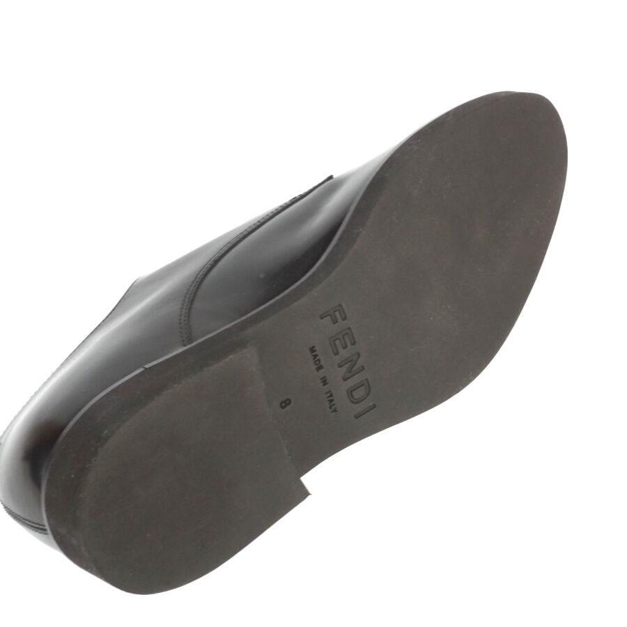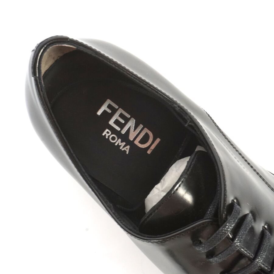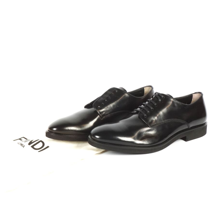 FENDI : Paire de chaussures type Derbies en cuir lisse de couleur noire, lacets, bouts ronds unis, numérotées sous la languette, taille indiquée 8, présentée avec sa housse d'origine (manque un lacet).