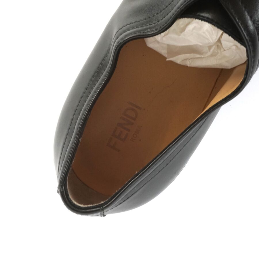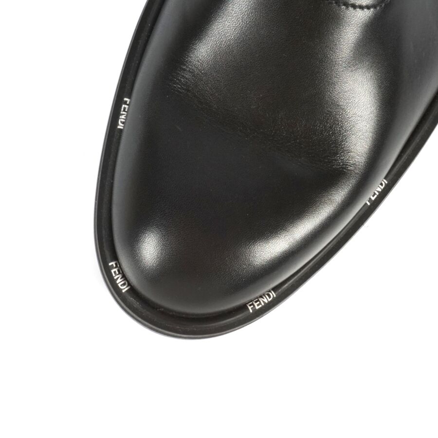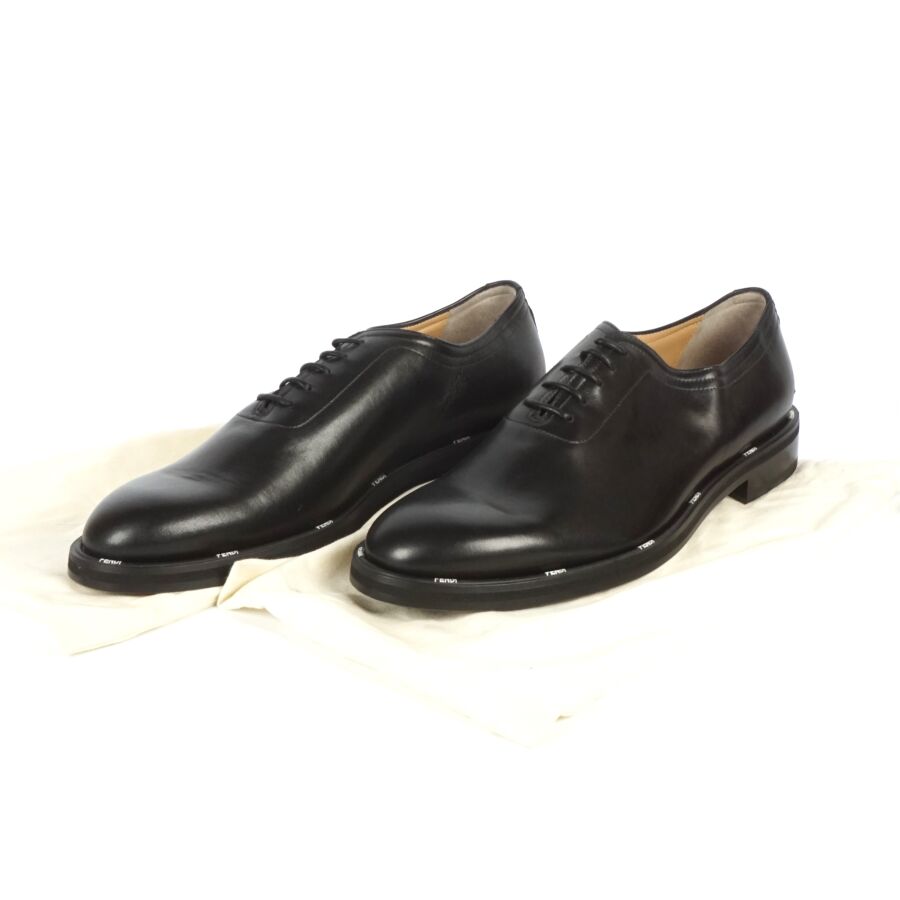 FENDI : Paire de chaussures type Derbies en cuir lisse de couleur noire, rebords de la semelle logotés en blanc, lacets noirs, taille indiquée 9, numérotées sous la languette, présentée avec ses housses d'origine (état neuf).