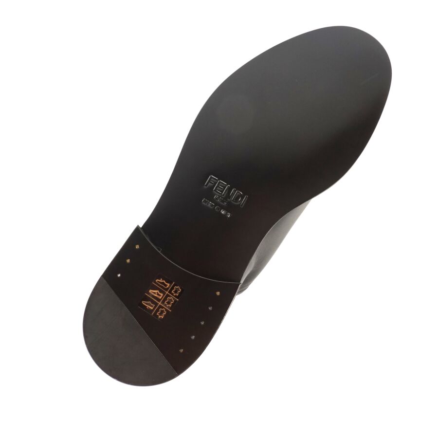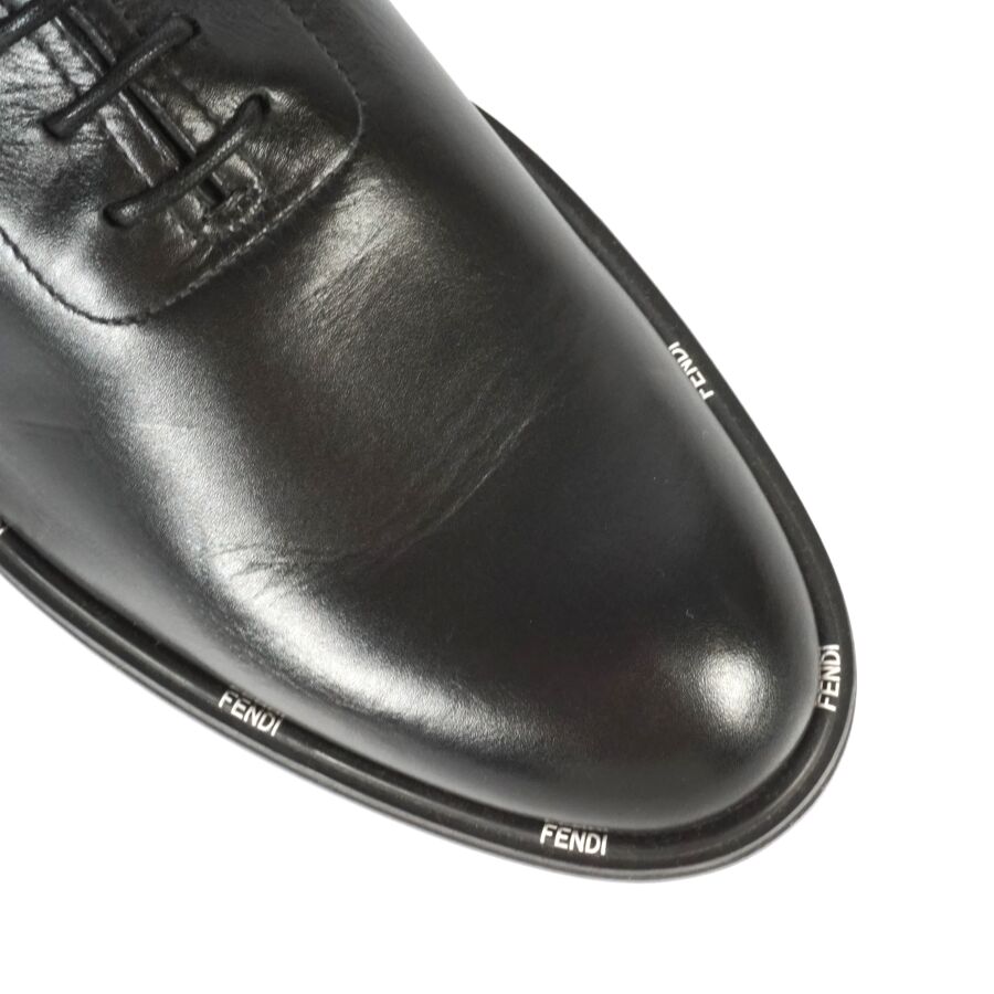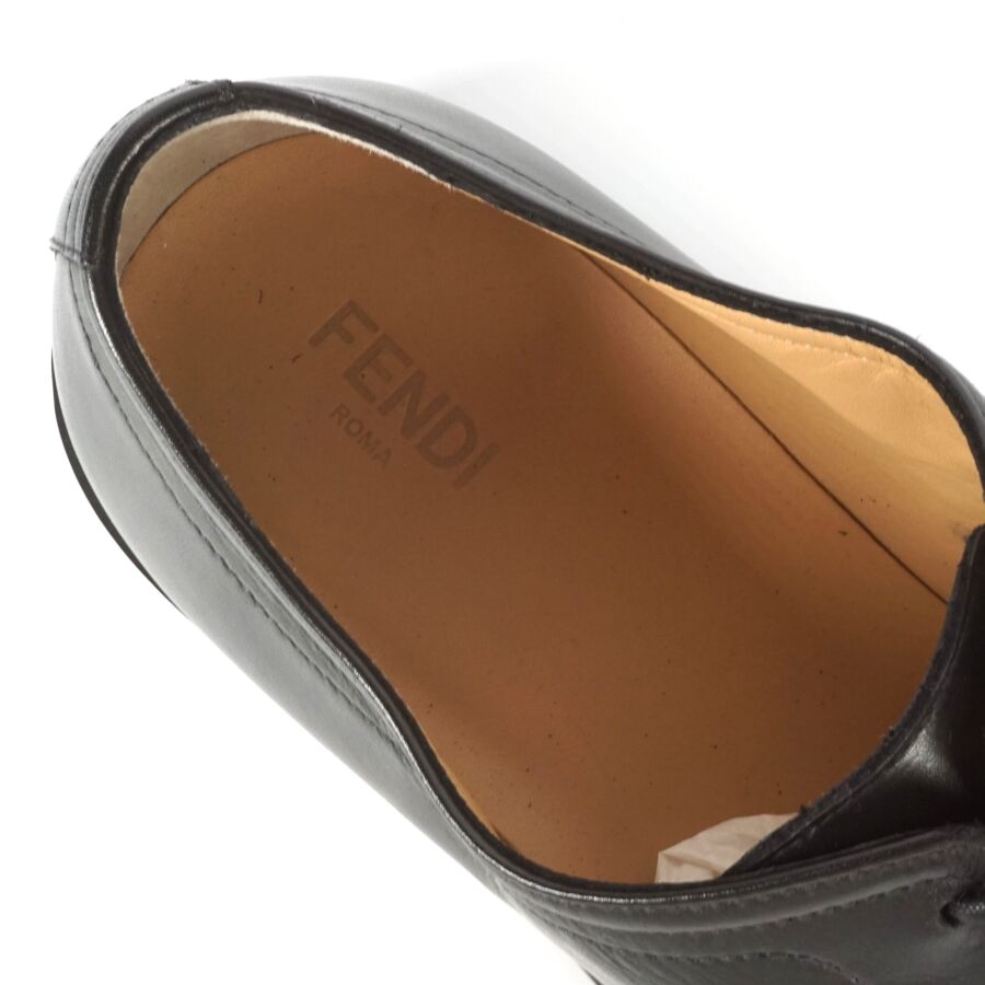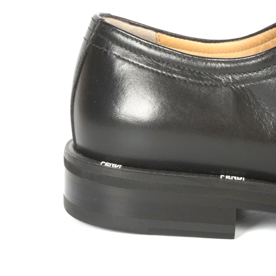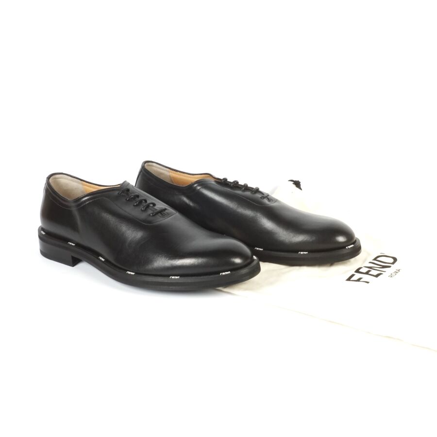 FENDI : Paire de chaussures type Derbies en cuir lisse de couleur noire, rebords de la semelle logotés en blanc, lacets noirs, taille indiquée 9, numérotées sous la languette, présentée avec ses housses d'origine (état neuf).