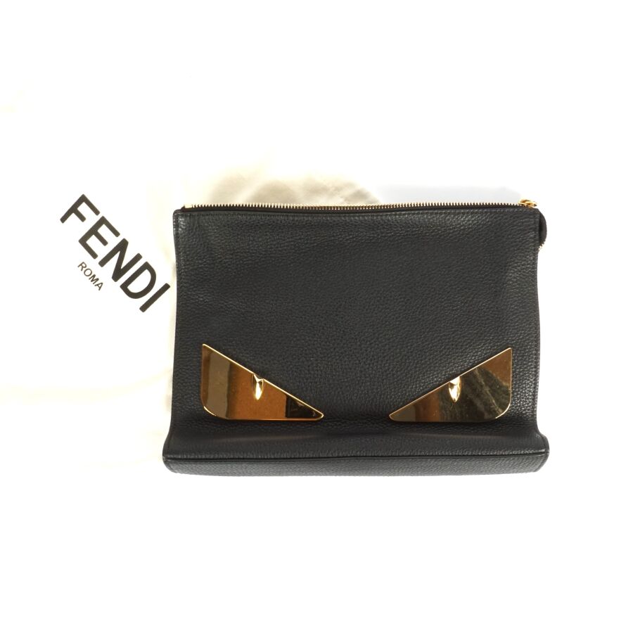 FENDI : Pochette modèle "Monster", cuir grainé de couleur noire et empiècement en métal doré, fermeture zippée avec languette en cuir noir, intérieur en tissu noir avec compartiments porte-cartes et pochette zippée intérieure, plaque interne en cuir signée et numérotée, présentée avec sa housse d'origine, Dim.20 x 27 x 4.3 cm (très légères usures d'usage).