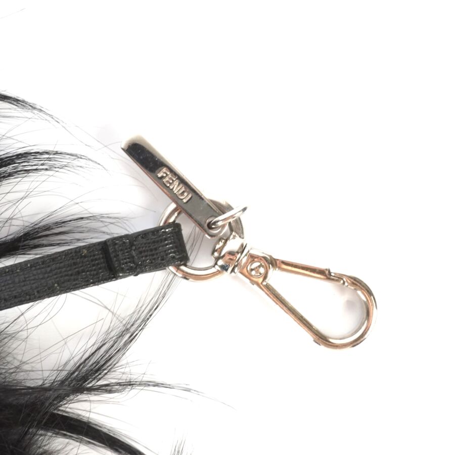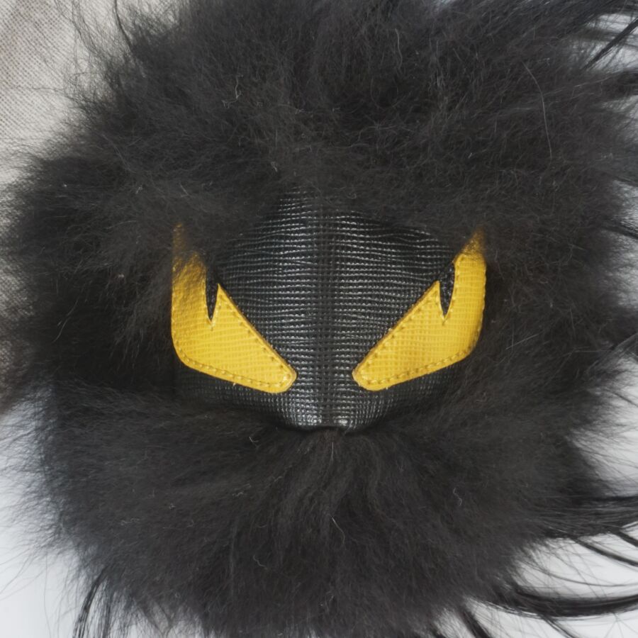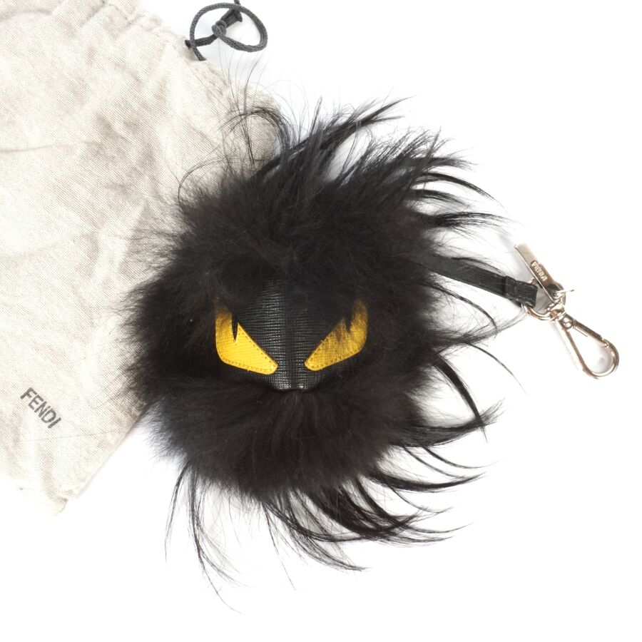 FENDI : Porte-clé modèle "Monster", cuir bicolore, noir et jaune et fourrure noire, bijouterie en métal argenté avec accroche et plaque logotée, dans sa housse d'origine.