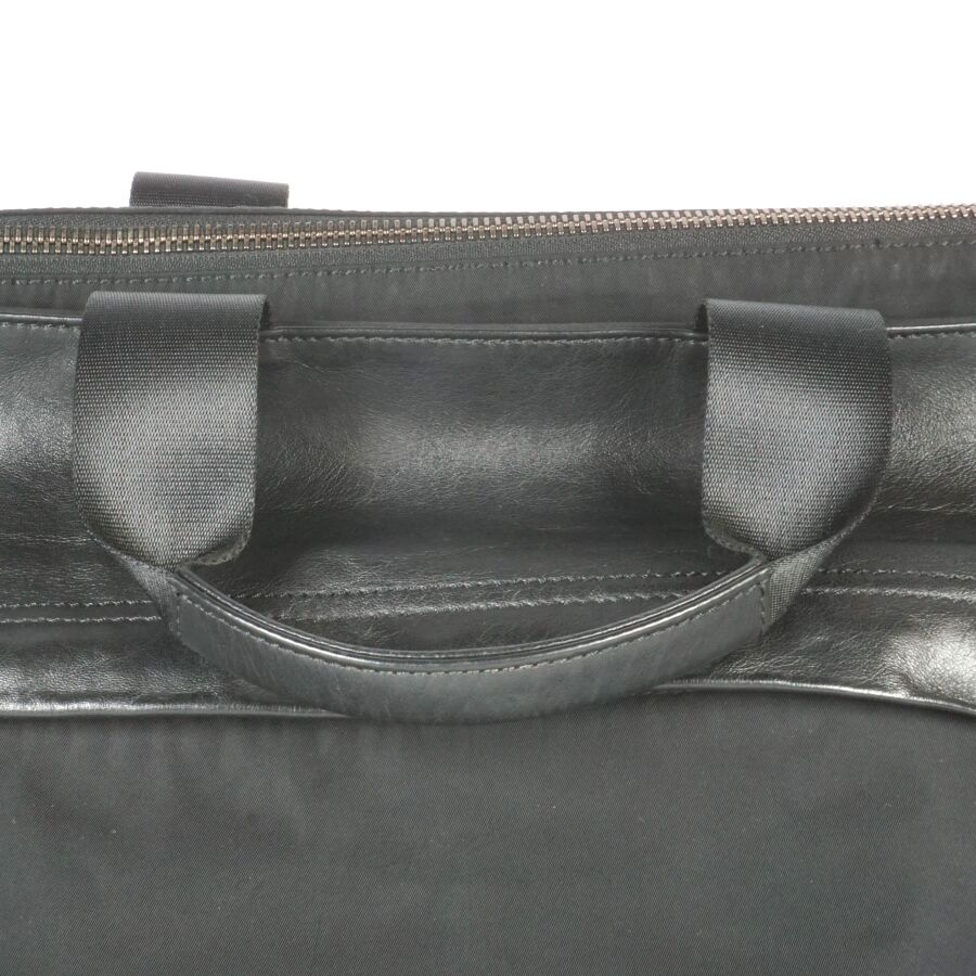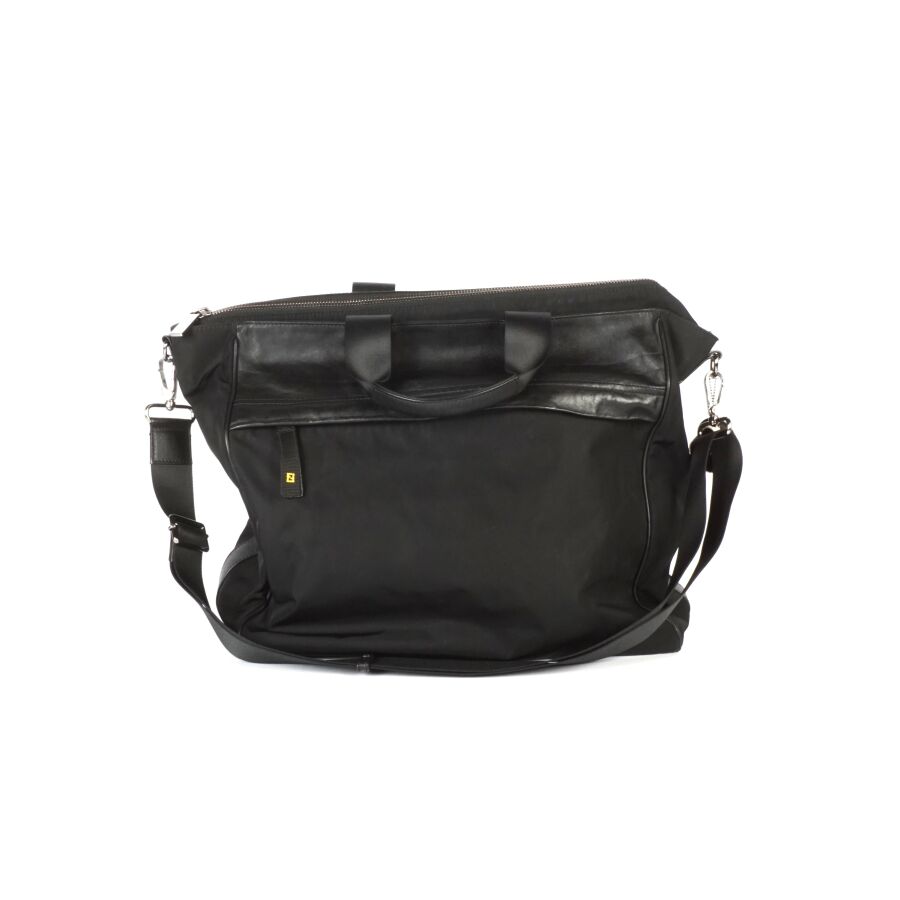 FENDI : Sac de voyage en nylon et cuir de couleur noir, fermeture principale zippée, bijouterie en métal argenté, deux anses pour un porté main, bandoulière réglable pour un porté épaule, pochette zippée à l'avant, languette logotée jaune sur fond noir, intérieur noir avec plaque en cuir numérotée et logotée, pochette interne zippée, accompagné de deux clés USB de la Maison, présenté avec sa housse d'origine, H. Hors anses : 30 x 50 x 13.5 cm (quelques traces et taches).