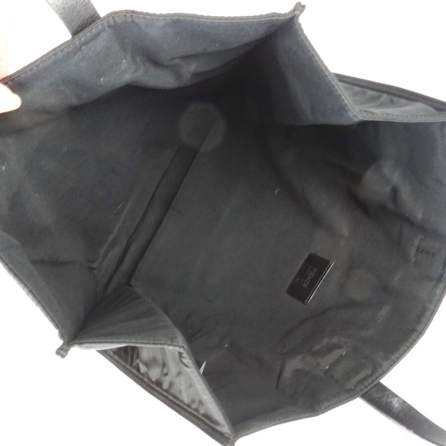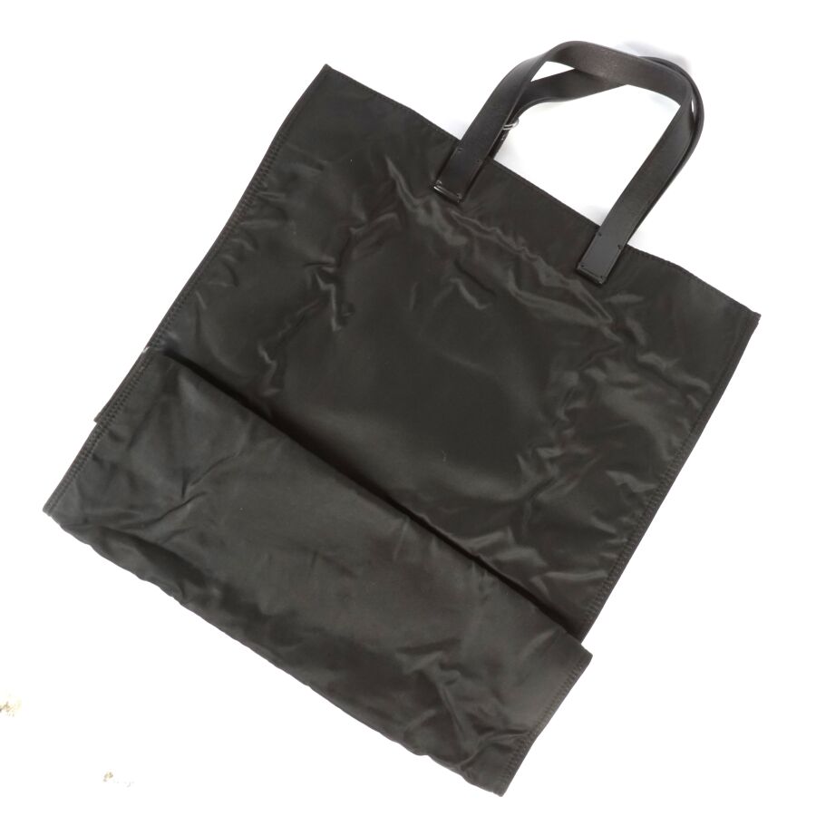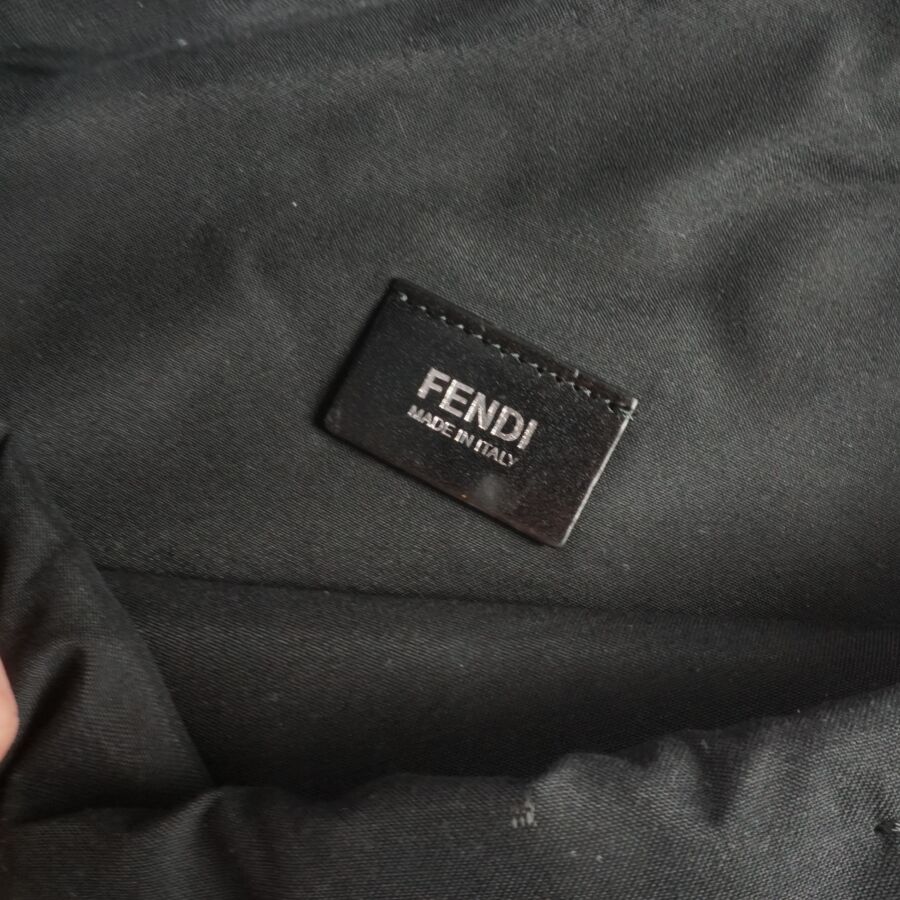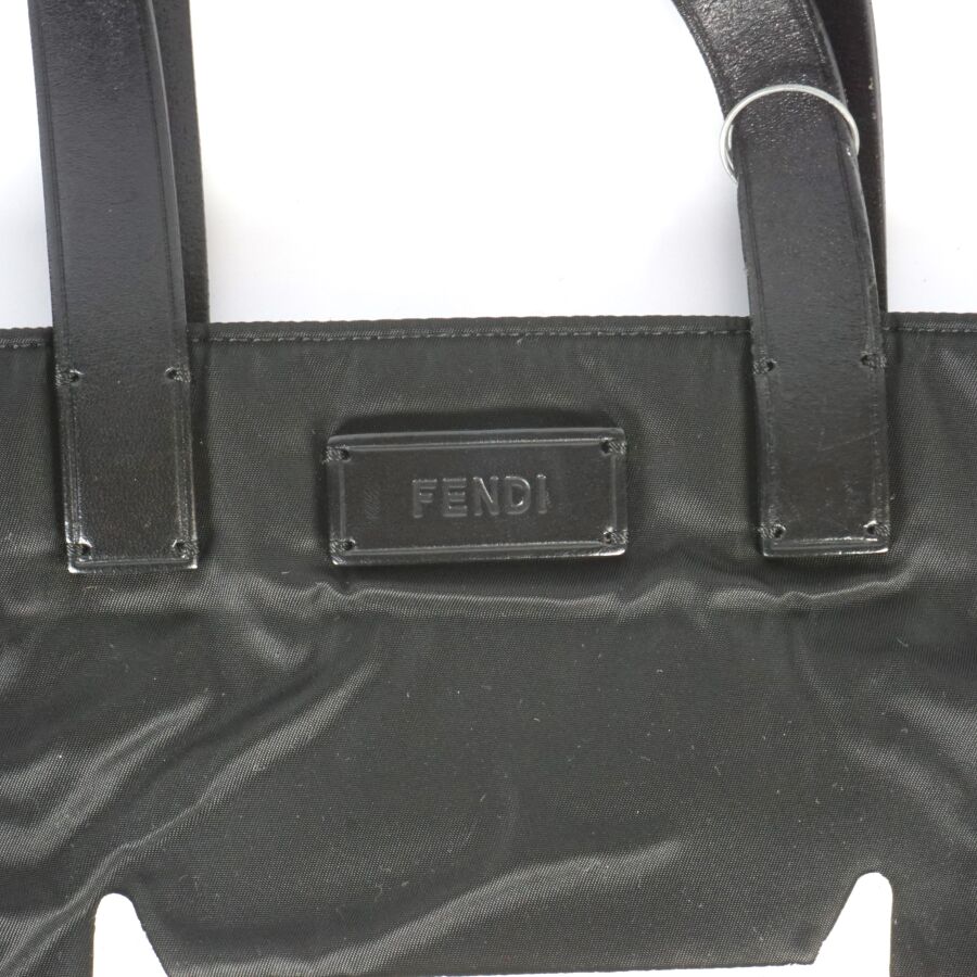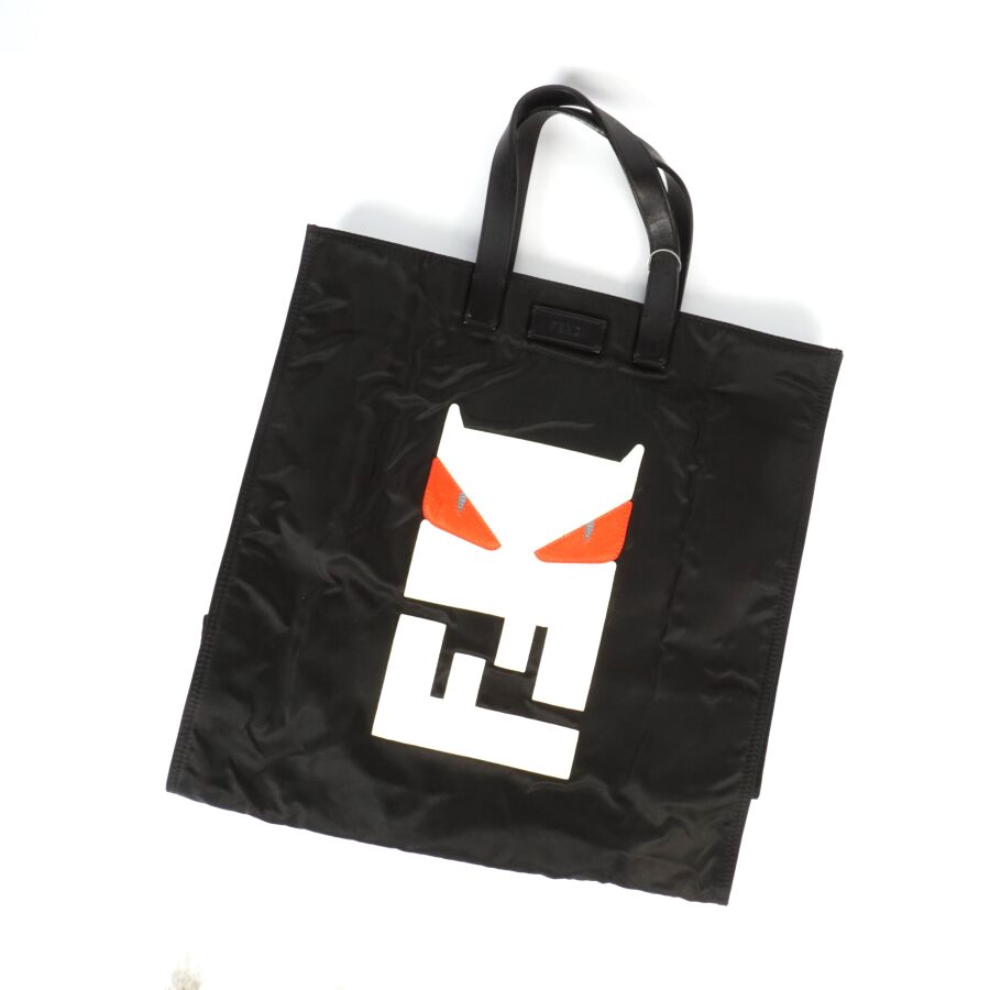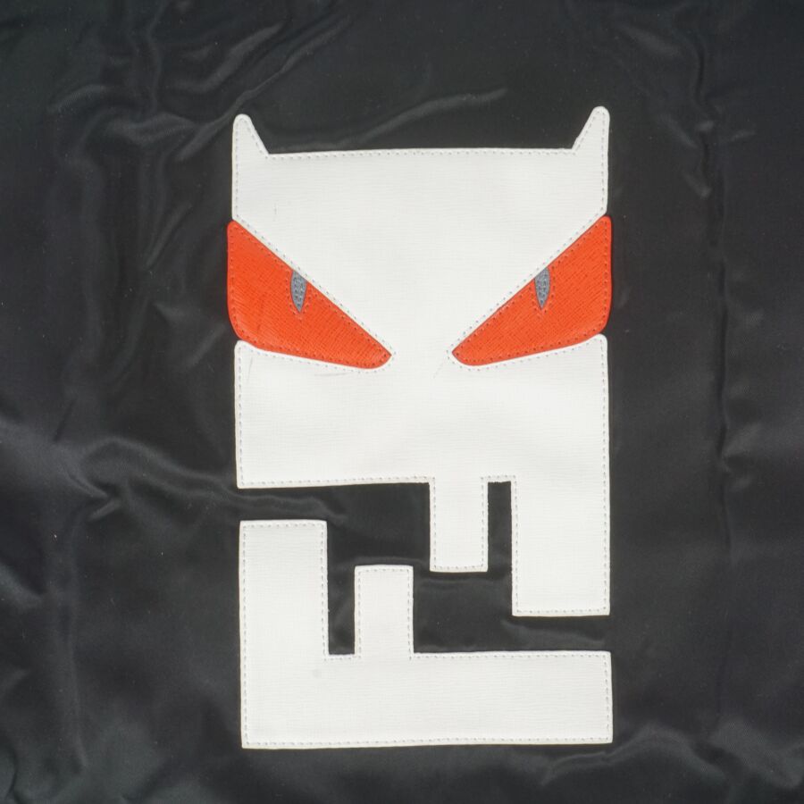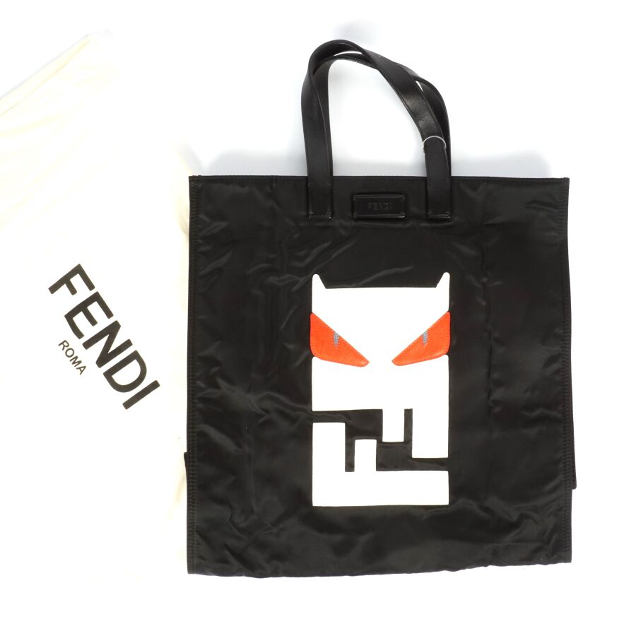 FENDI : Sac fourre-tout modèle "Monster" en nylon noir, empiècement en cuir blanc et rouge, logoté, deux anses en cuir noir pour un porté main, intérieur noir avec plaque en cuir logotée et numérotée, présenté avec une housse d'origine, H. Hors anses : 36 cm. Larg. 34 cm (très légères usures d'usage).