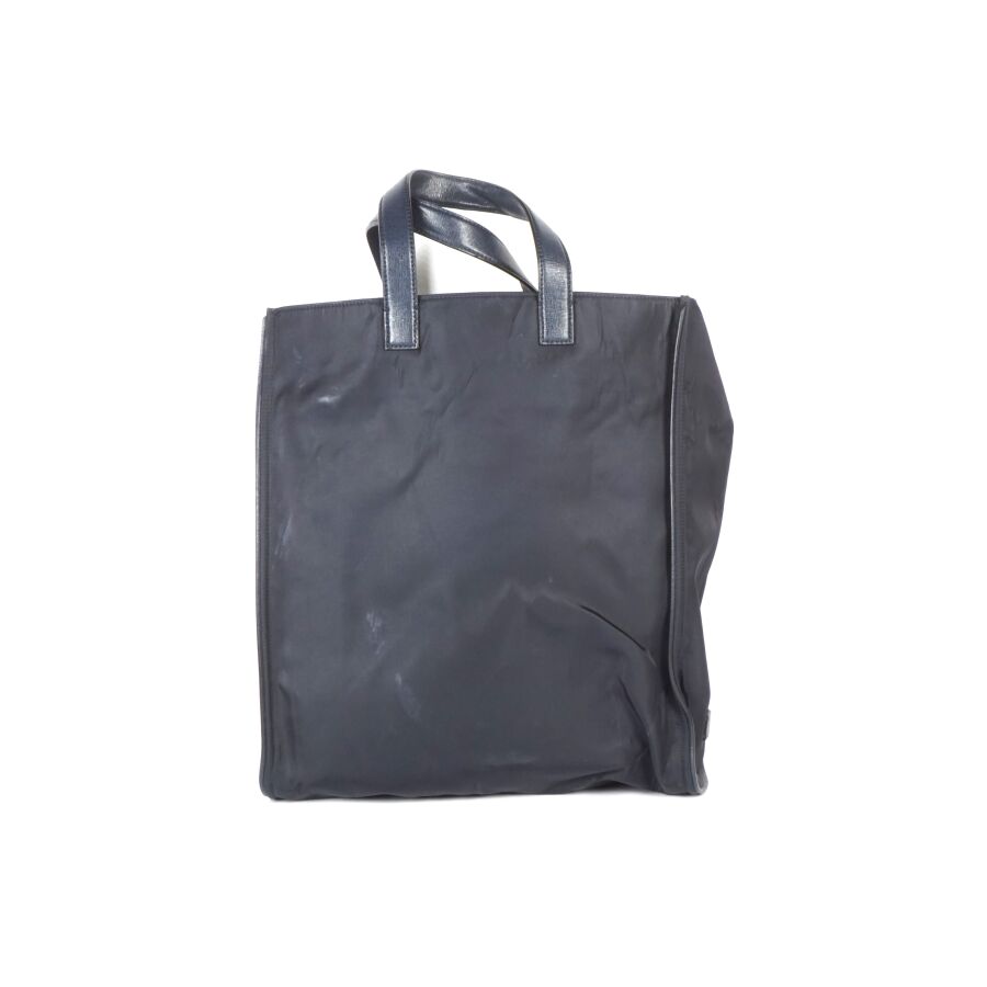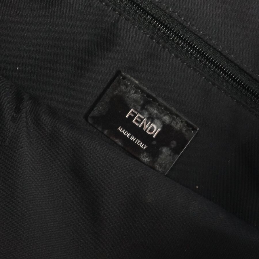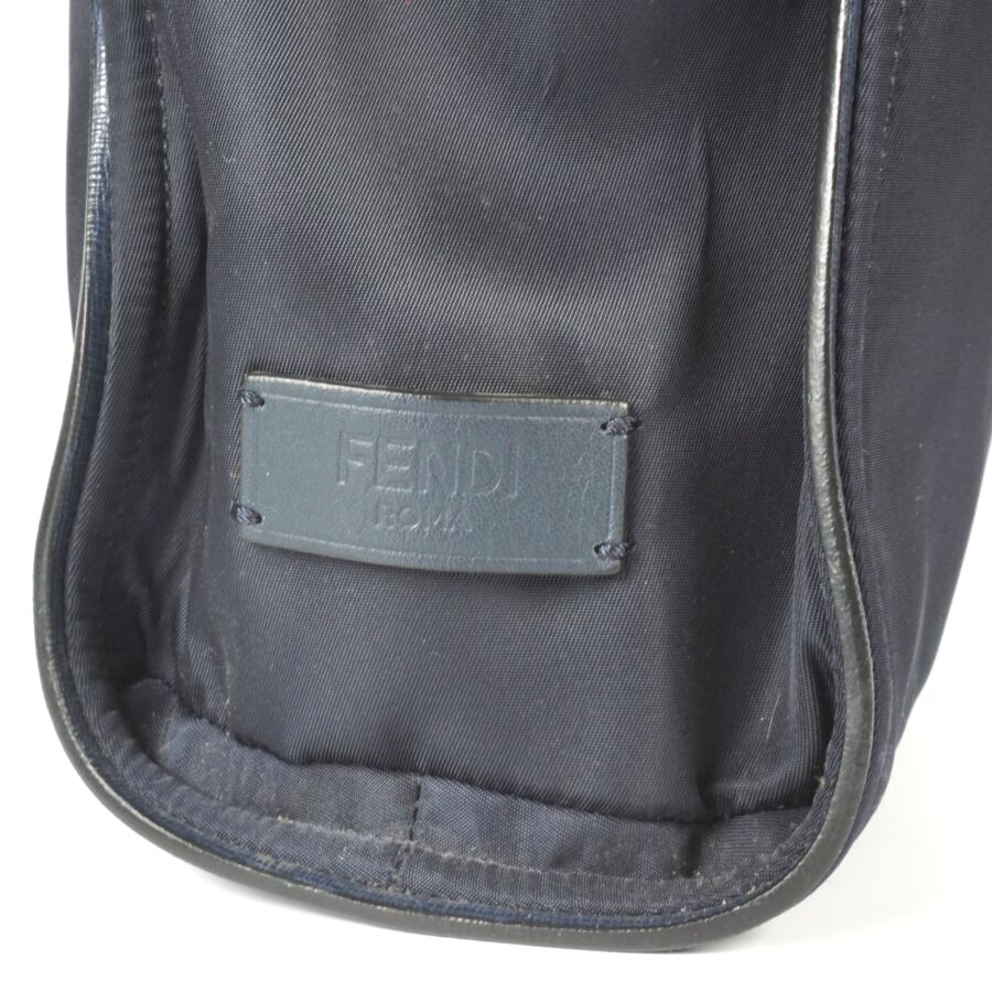 FENDI : Sac fourre-tout modèle 'Monster", nylon de couleur bleue nuit, empiècement en cuir blanc et rouge, pochette zippée à l'avant avec languette en cuir et étiquette logotée, deux anses en cuir bleu pour un porté main et épaule, pochette intérieure zippée avec plaque en cuir numérotée et logotée, intérieur noir, H. Hors anses : 40/41 cm. Larg. 34 cm (petites usures d'usage légères).
