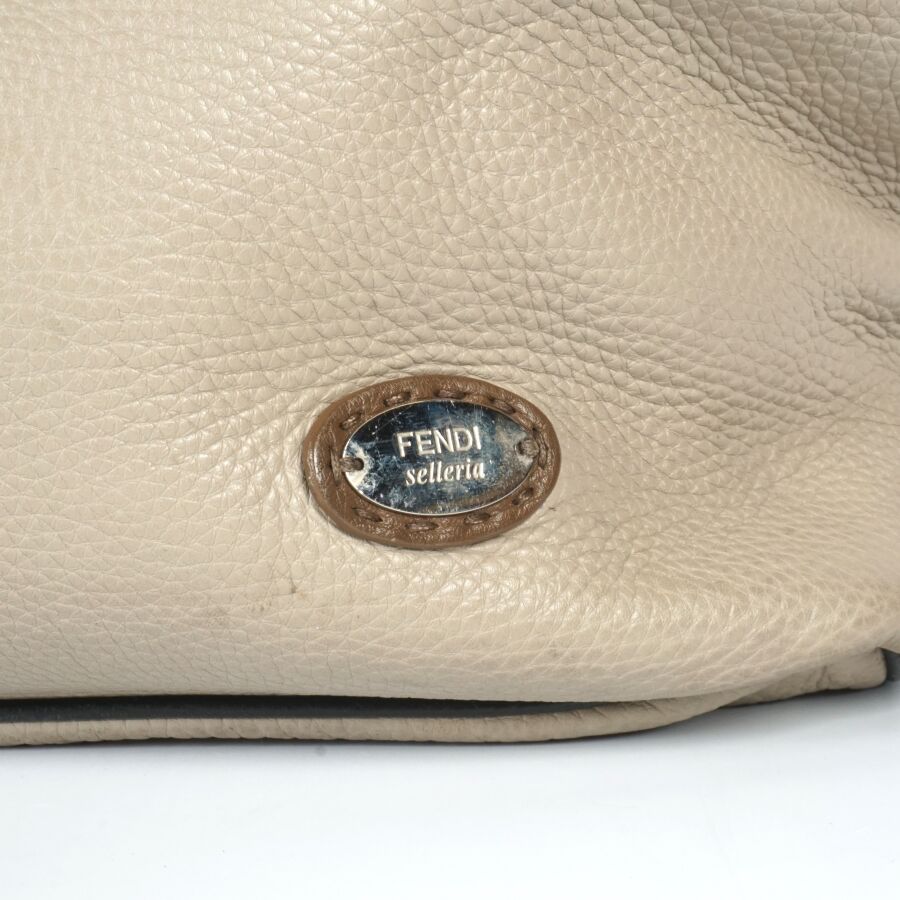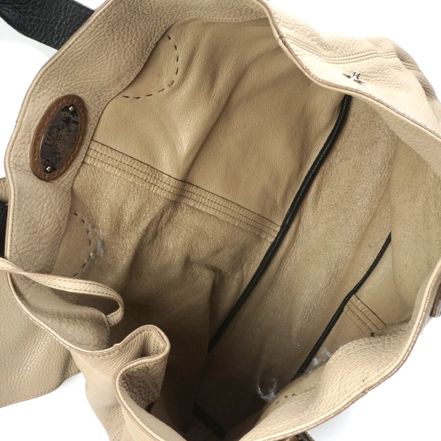 FENDI : Sac fourre-tout "Selleria" en cuir grainé beige, marron et noir, plaque ovale en métal argenté logoté sur la partie basse de l'une des deux faces, boutons pression sur chacun des côtés du sac, deux anses à boucle en métal argenté logoté pour un porté main, numéroté à l'intérieur, intérieur beige avec une pochette mobile à fermeture zippée, présenté avec son dustbag, Dim. Hors anses : 33 x 55 x 9 cm environ (quelques traces et usures d'usage).