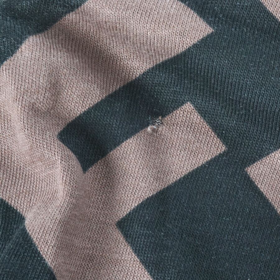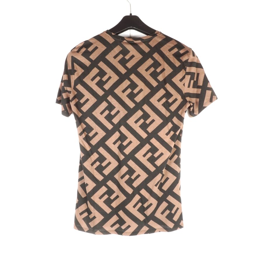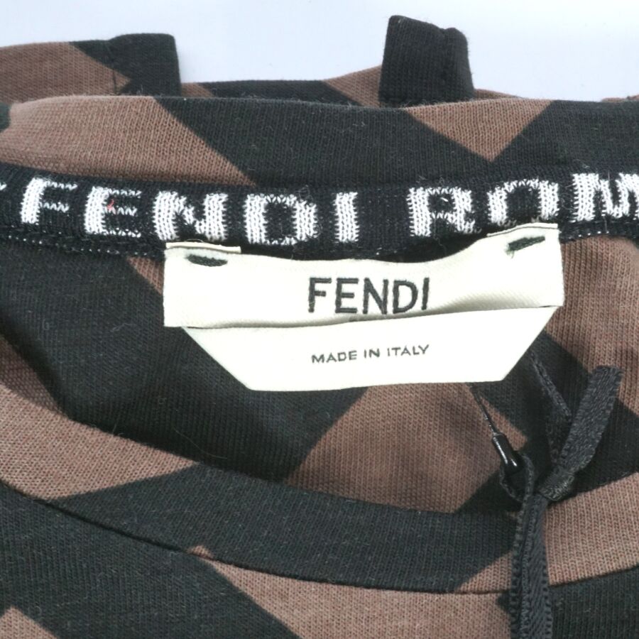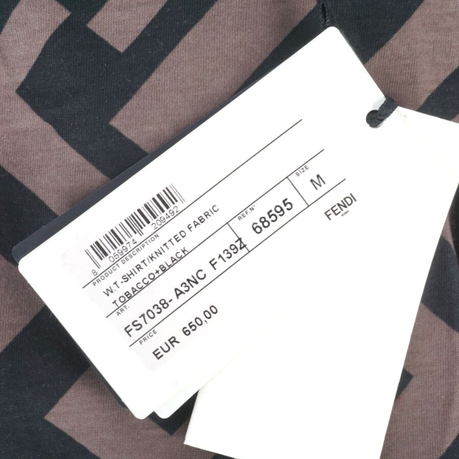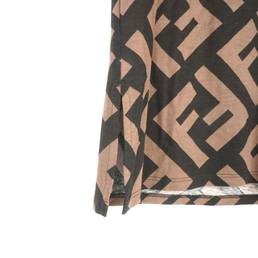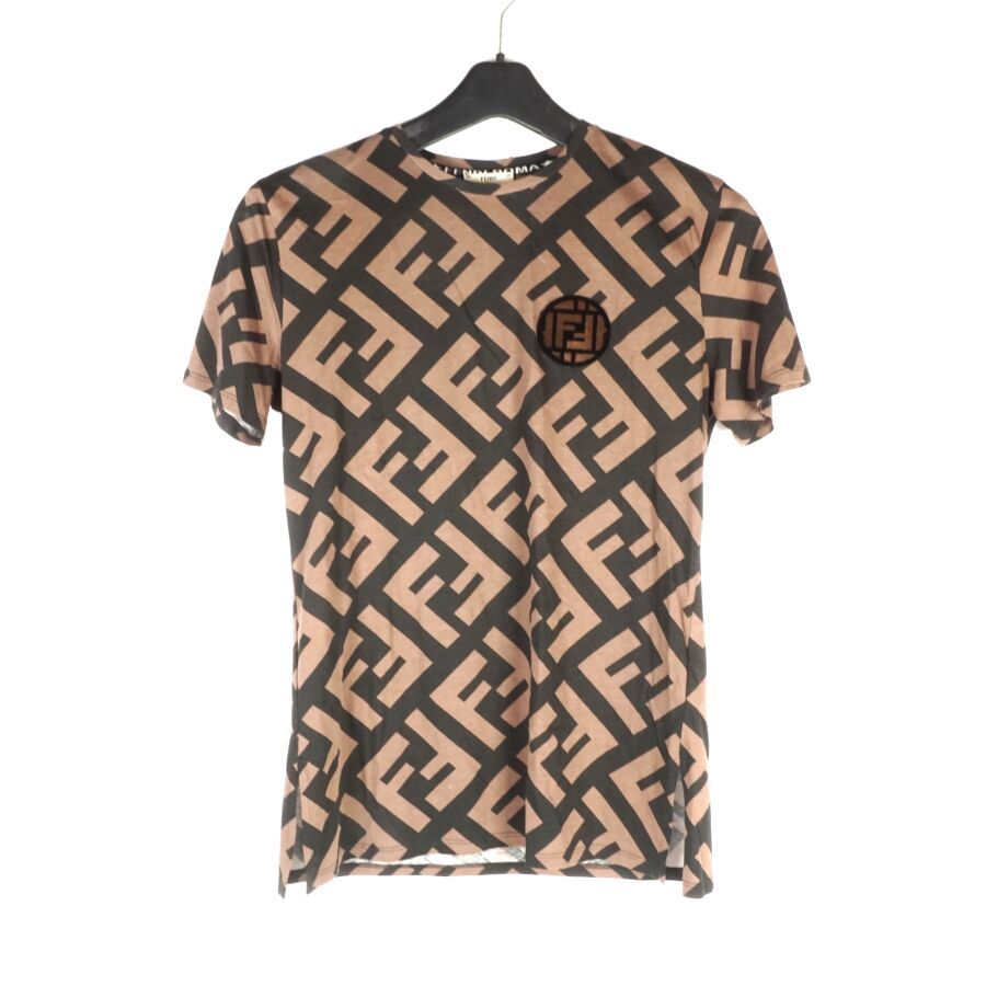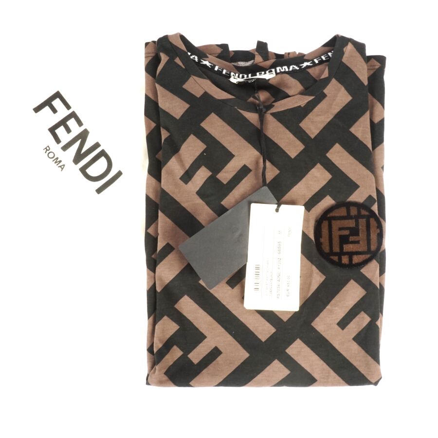 FENDI : Tee-shirt en coton brun et noir à motif monogrammé, col rond, manches courtes, monogramme brodé de forme circulaire, légèrement fendu sur les côtés, taille indiquée M, avec étiquettes intérieures et étiquettes de boutique, présenté dans sa housse d'origine, L. 68 cm (petit trou).
