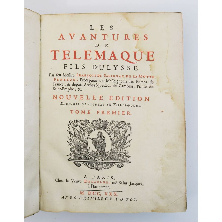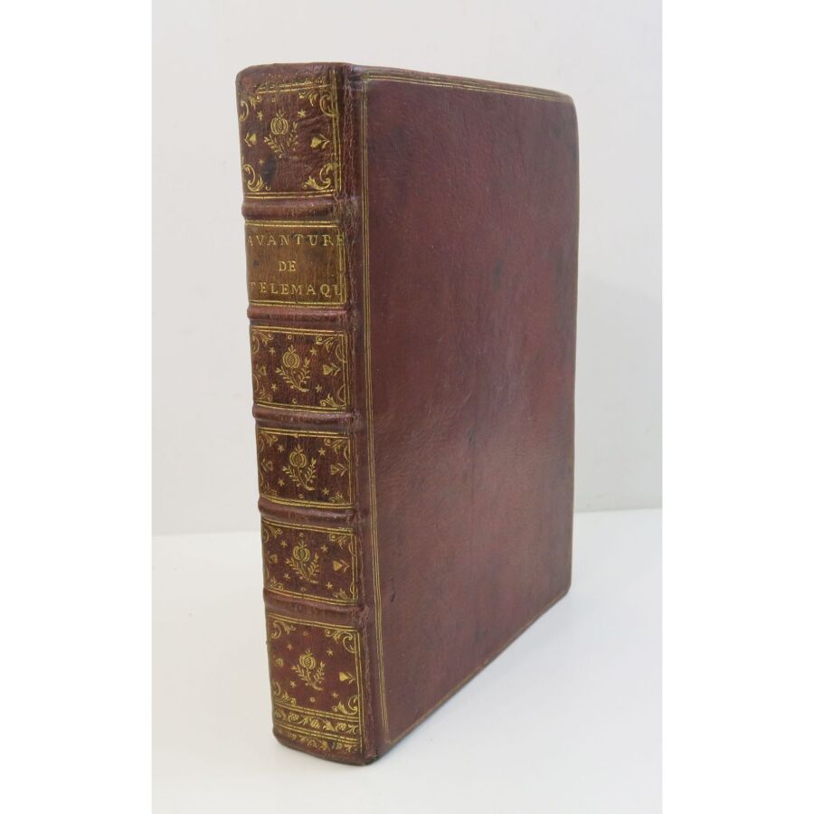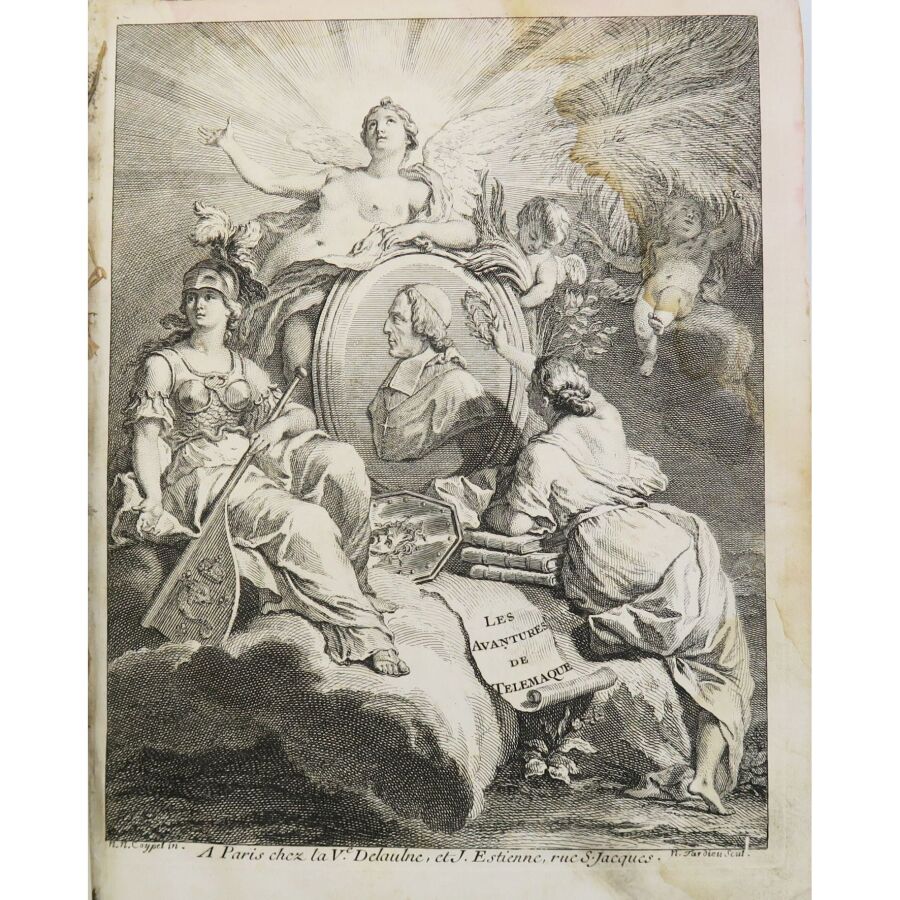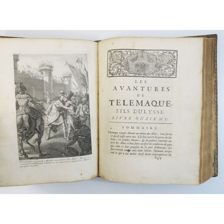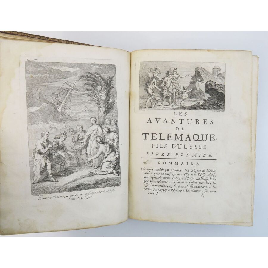 FÉNELON (François de Salignac de La Mothe). Les aventures de Telemaque fils d'Ulysse. Paris, Delaulne, 1730. 2 tomes reliés en un volume in-4, maroquin rouge, dos à nerfs ornés, triple filet doré encadrant les plats, double filet doré sur les coupes, roulette intérieure, tr. dorées (reliure de l'époque). Belle édition illustrée d'un frontispice par Charles-Antoine Coypel, d'une carte dépliante du voyage de Télémaque et de 24 bandeaux, de 24 lettrines et de 24 planches hors-texte dessinée par Coypel, Humblot, Souville et gravées par Lebas, Scotin, etc. (Cohen 380.)