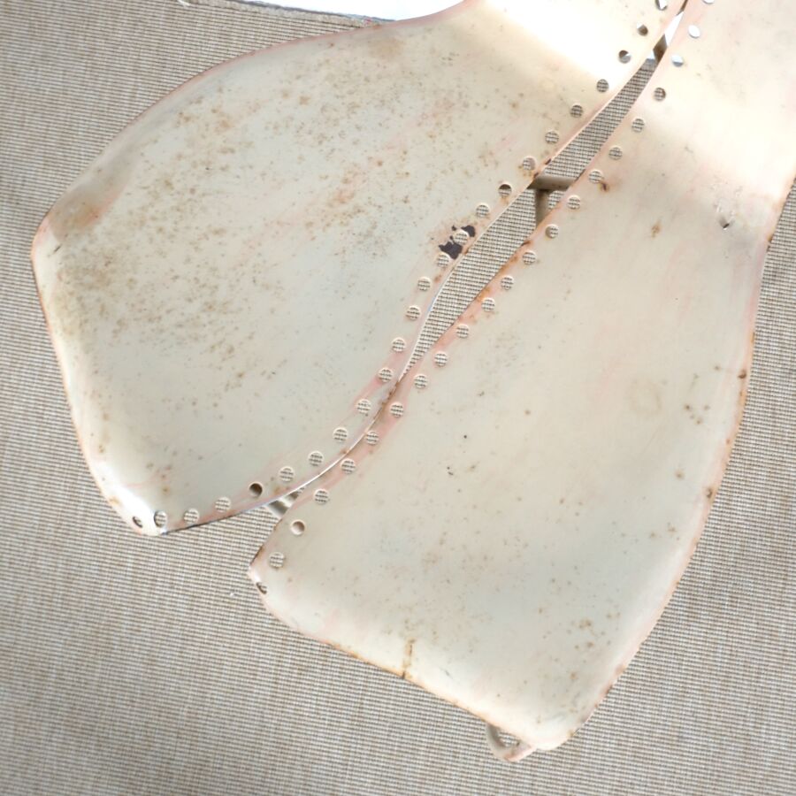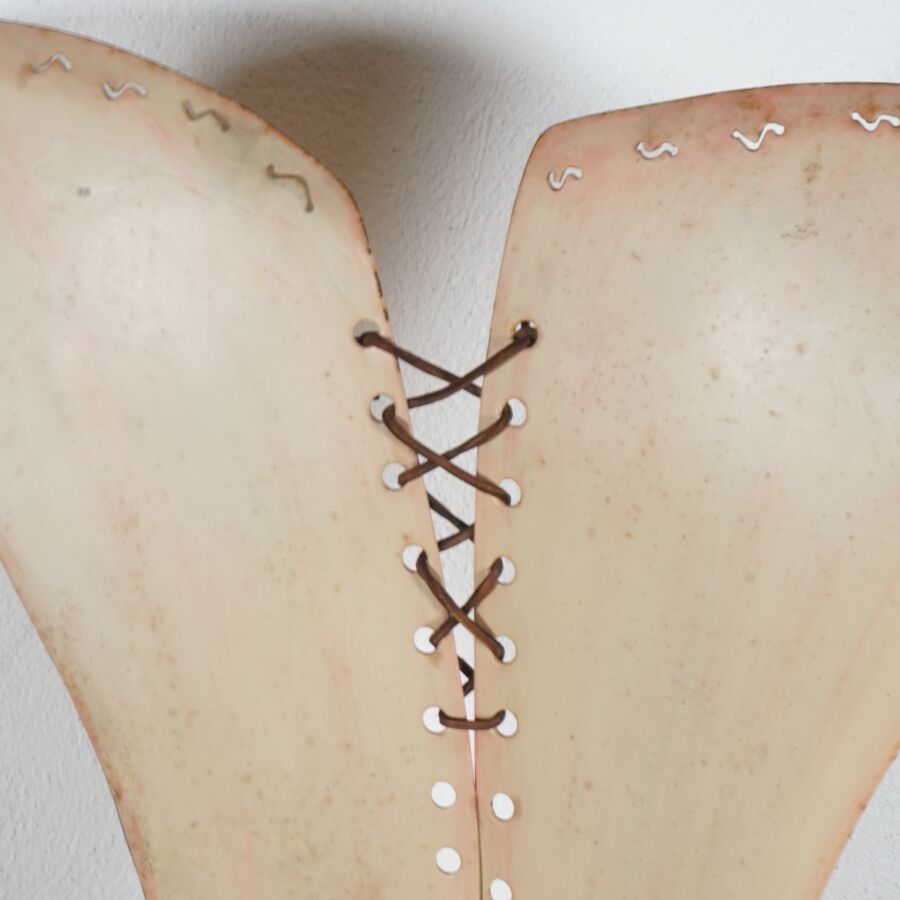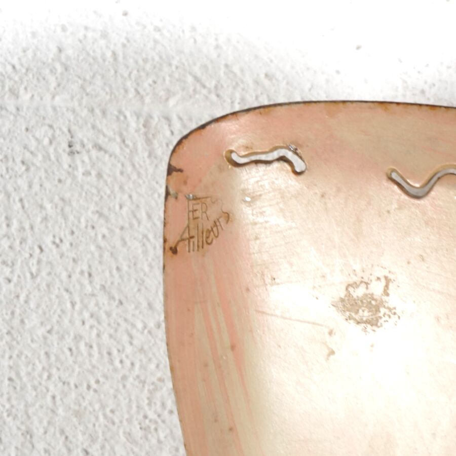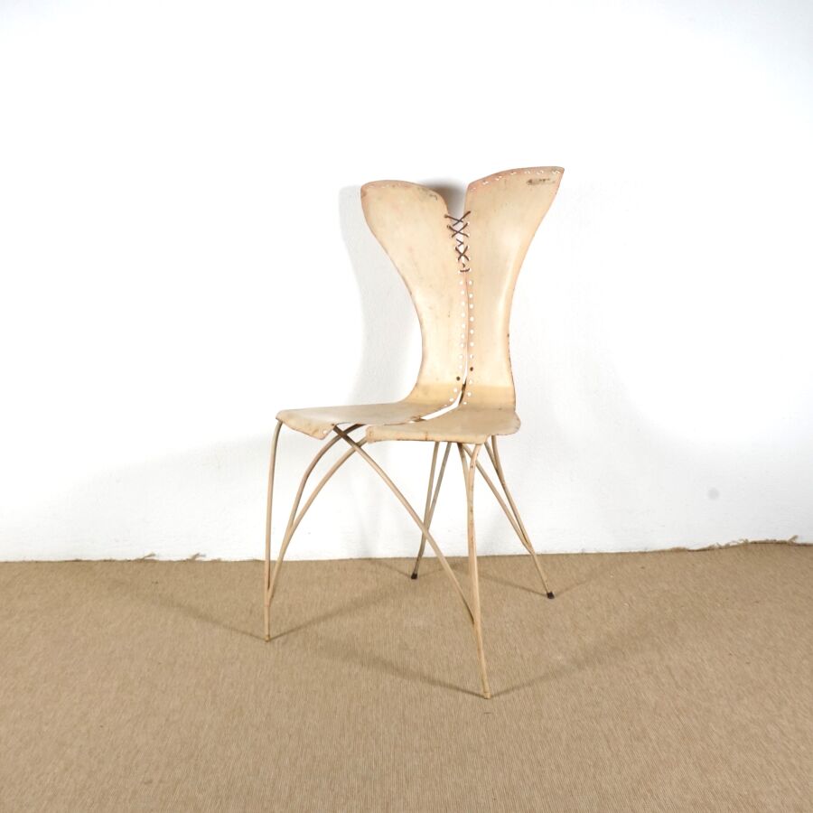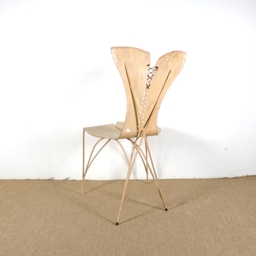 FER AILLEURS - Dans le goût de Gérard COQUELIN (1947), Chaise "Corset" en métal laqué marron et lanière, H. 95.5 cm (usures).