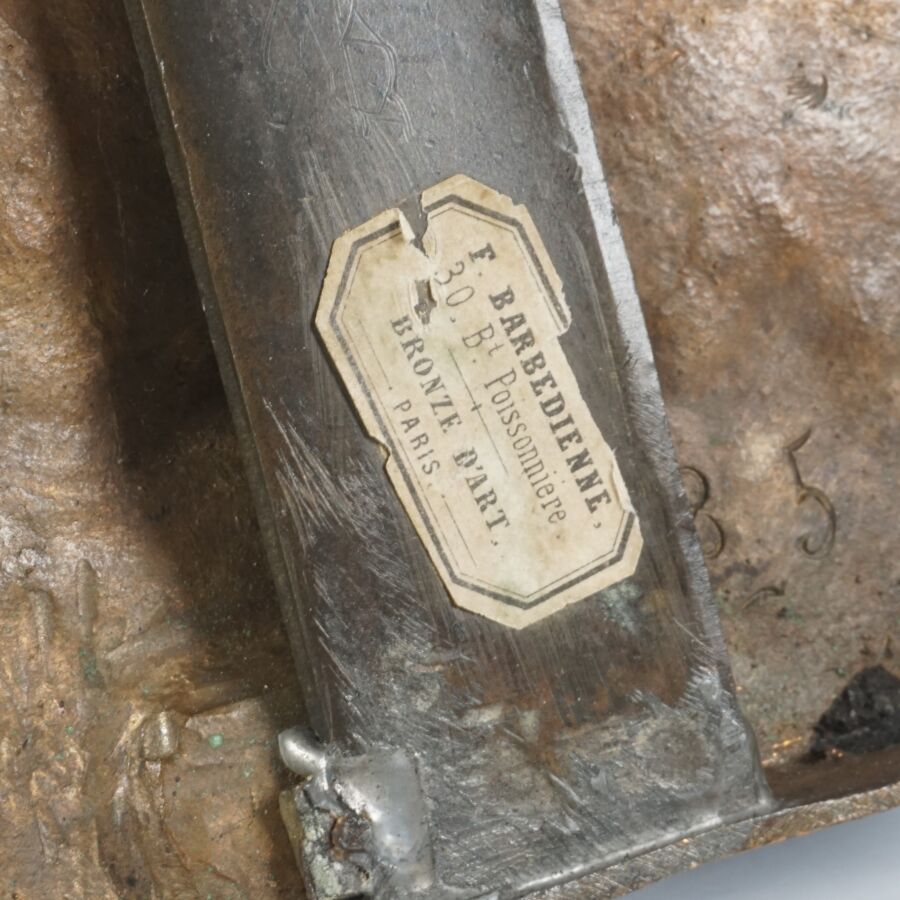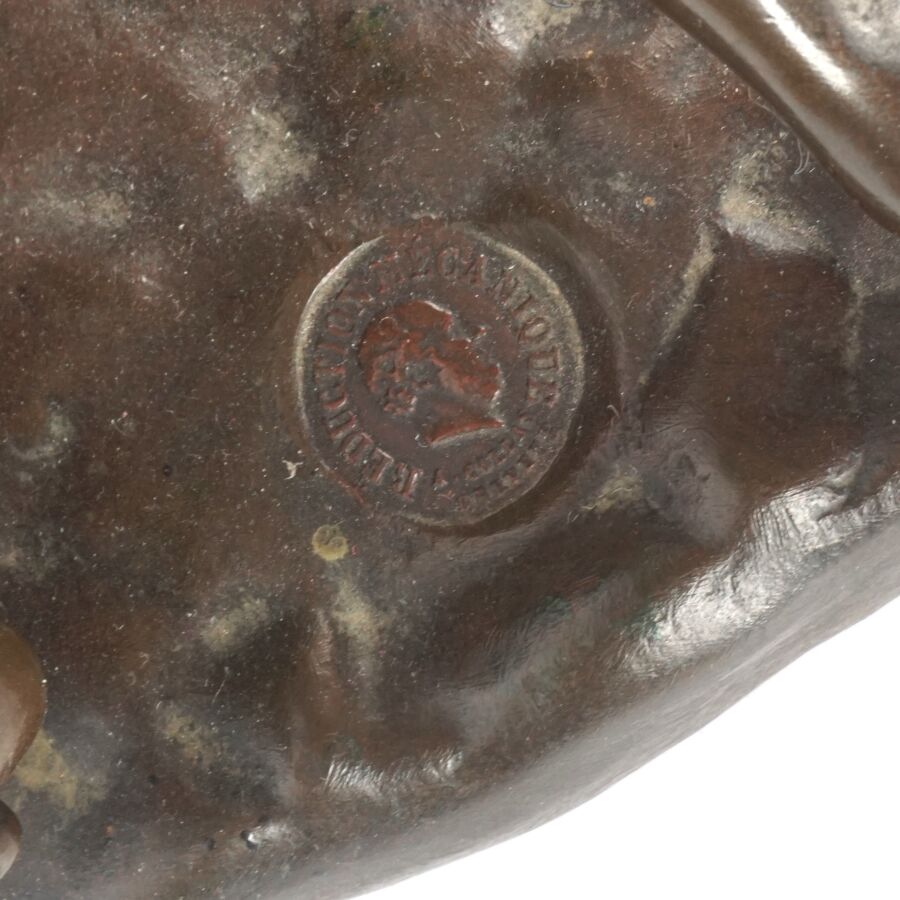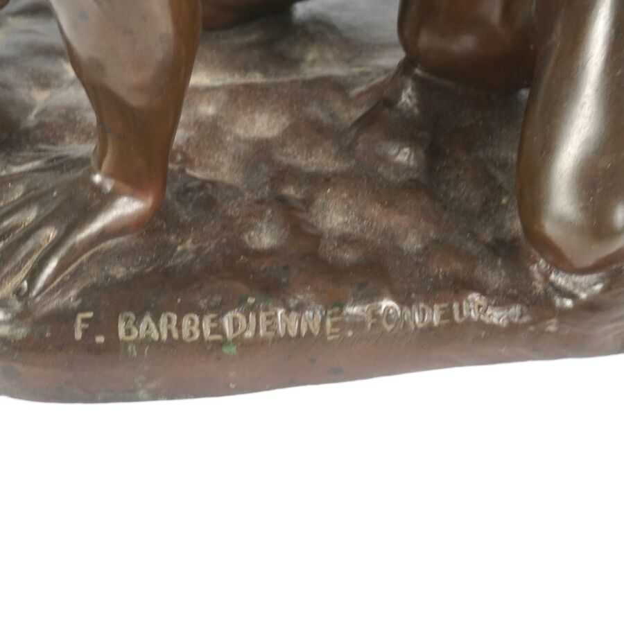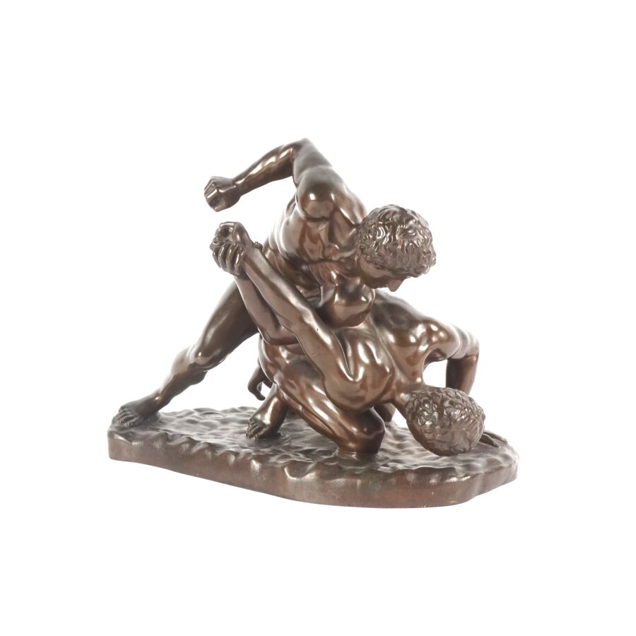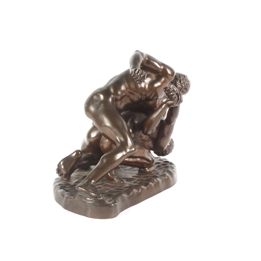 Ferdinand BARBEDIENNE (1810-1892), d'après l'Antique, "Lutteurs", sculpture en bronze à patine marron, réduction mécanique Collas, signée en creux, étiquette dessous, Dim. 18.5 x 21 cm.