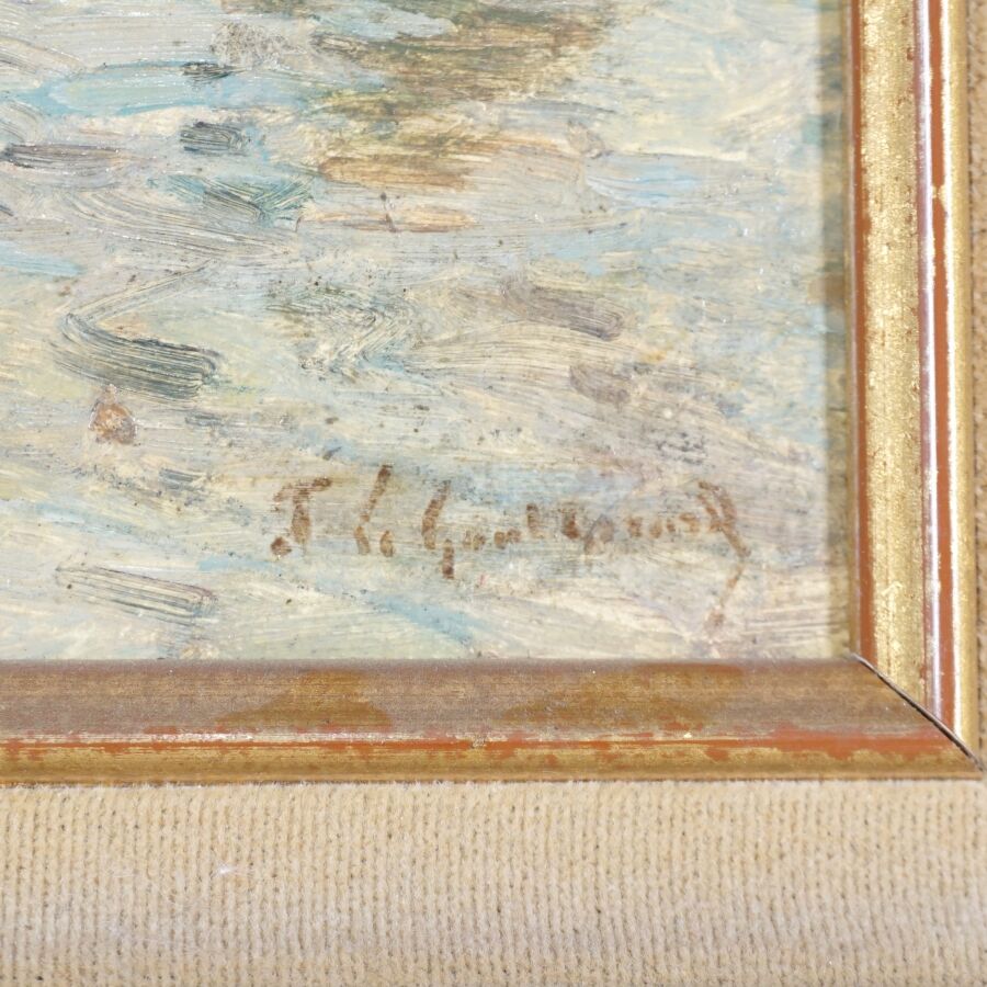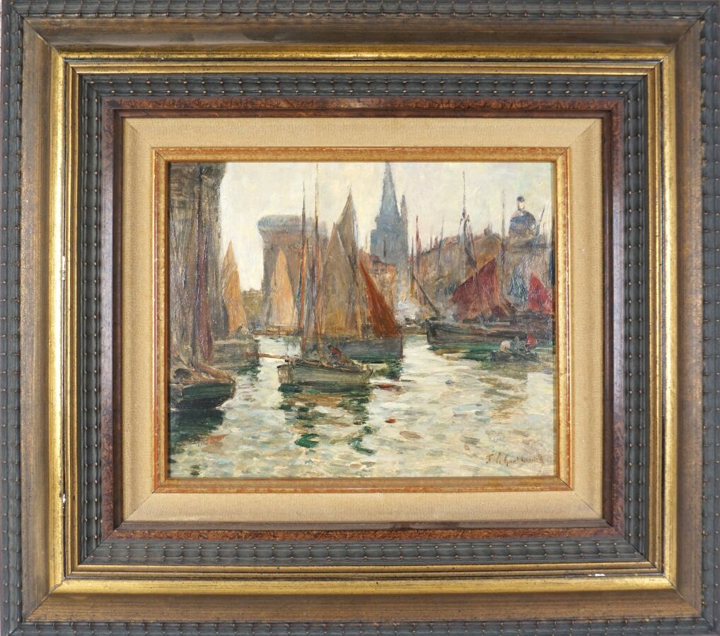 Fernand LEGOUT-GERARD (1856-1924), "Voiliers au port", huile sur panneau signée en bas à droite, 21.7 x 26.8 cm.