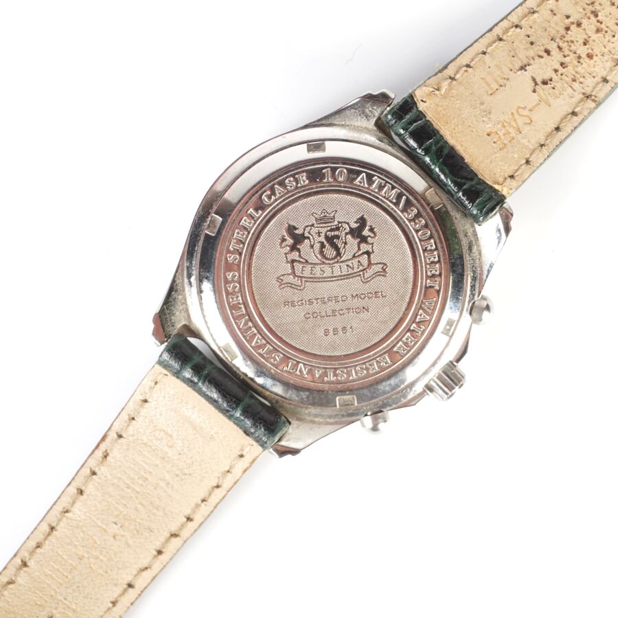 FESTINA : Montre d'homme, boitier rond en acier, 40 mm, cadran argenté à index, 3 compteurs, dateur à 3h, fond signé, bracelet cuir vert probablement rapporté, boucle ardillon, mouvement à quartz.