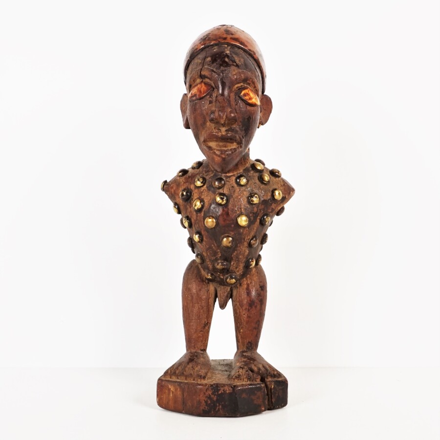 Fétiche en bois et métal figurant un homme debout, le corps couvert de clous, la tête et les yeux en cuivre, style Youmbé, République démocratique du Congo, H. 25 cm (petit accident à la jambe).