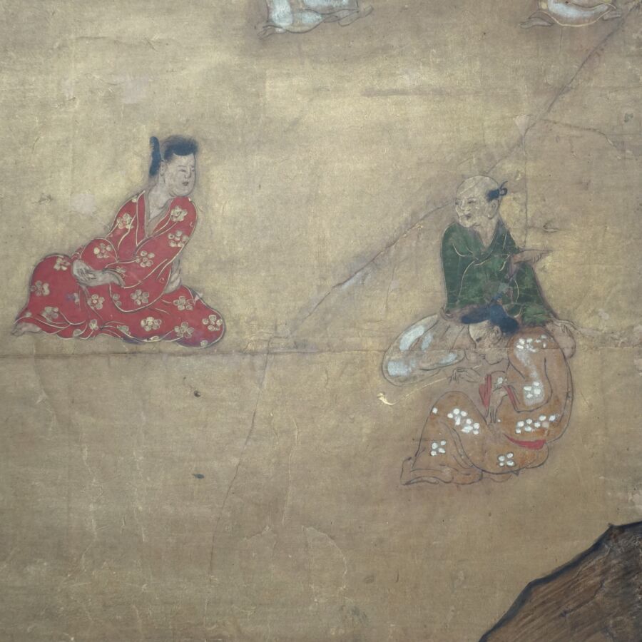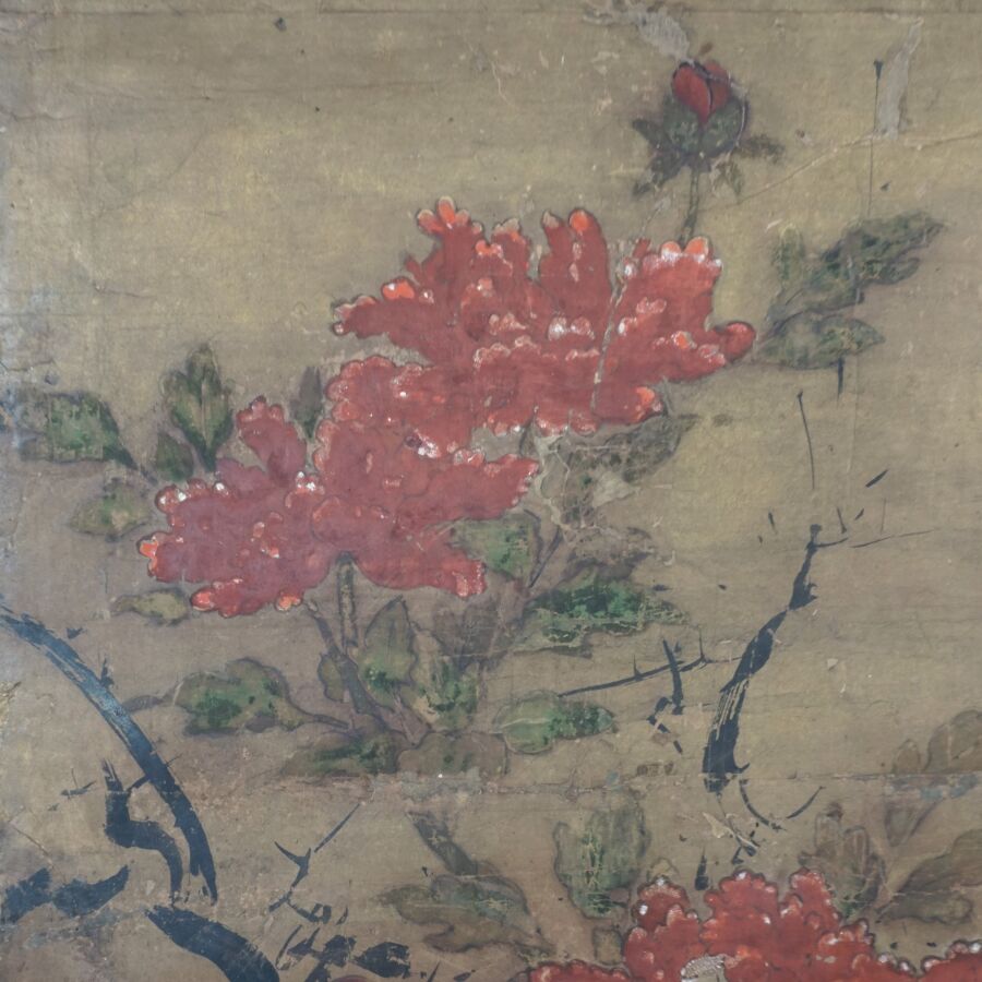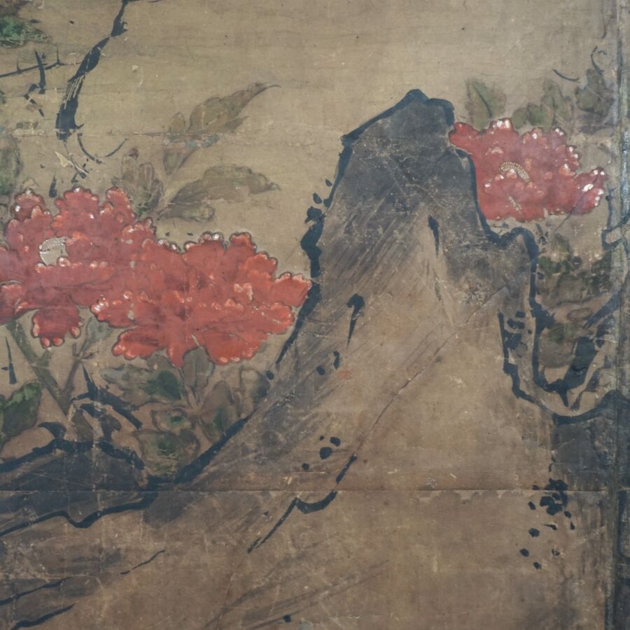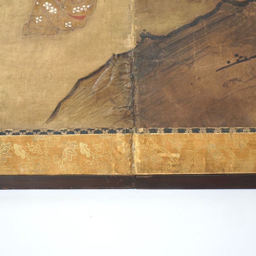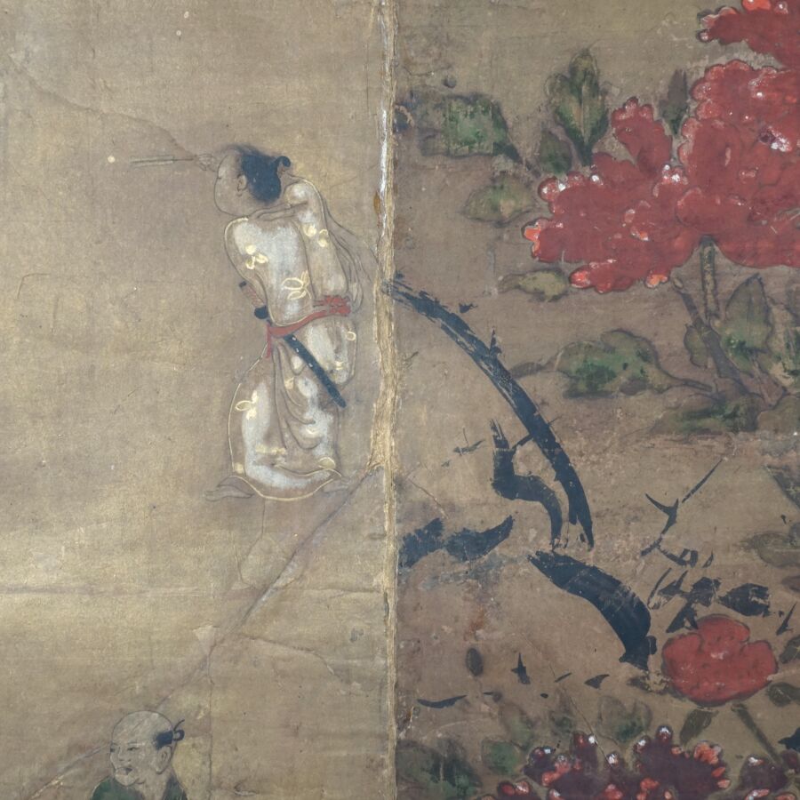 Feuille de paravent à décor polychrome et rehauts d'or sur papier de personnages parmi des fleurs de pivoines et montagnes, Japon, 17ème siècle, 91.5 x 131 cm (usures, taches).