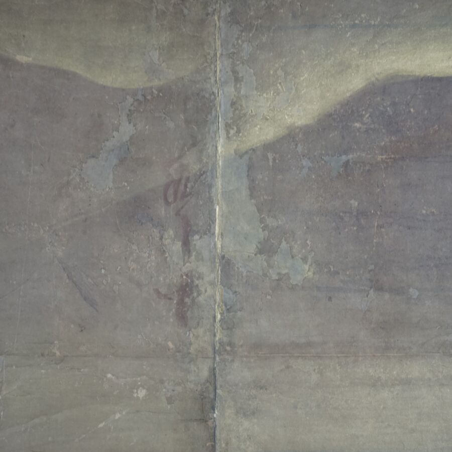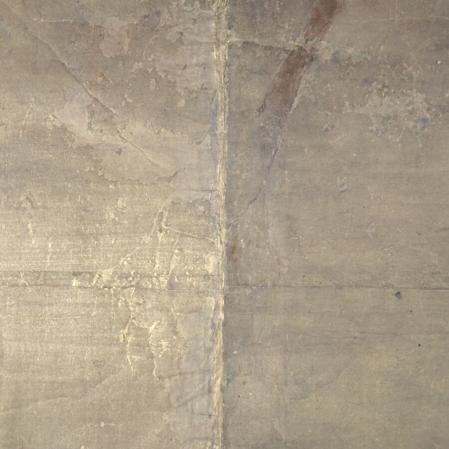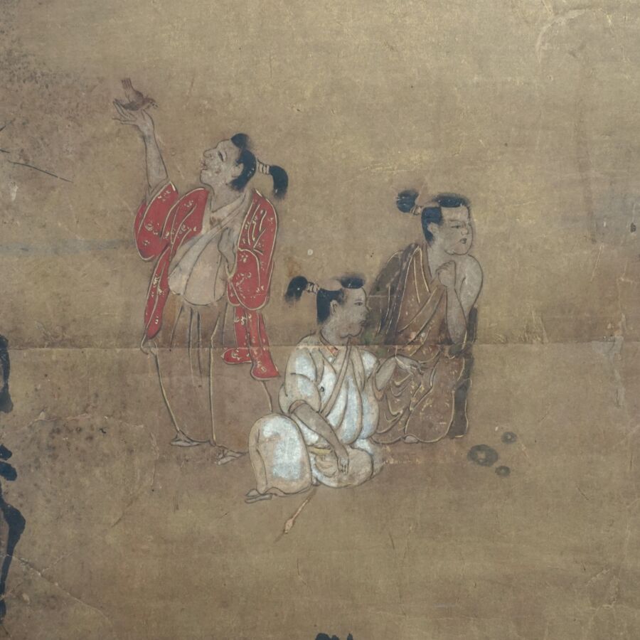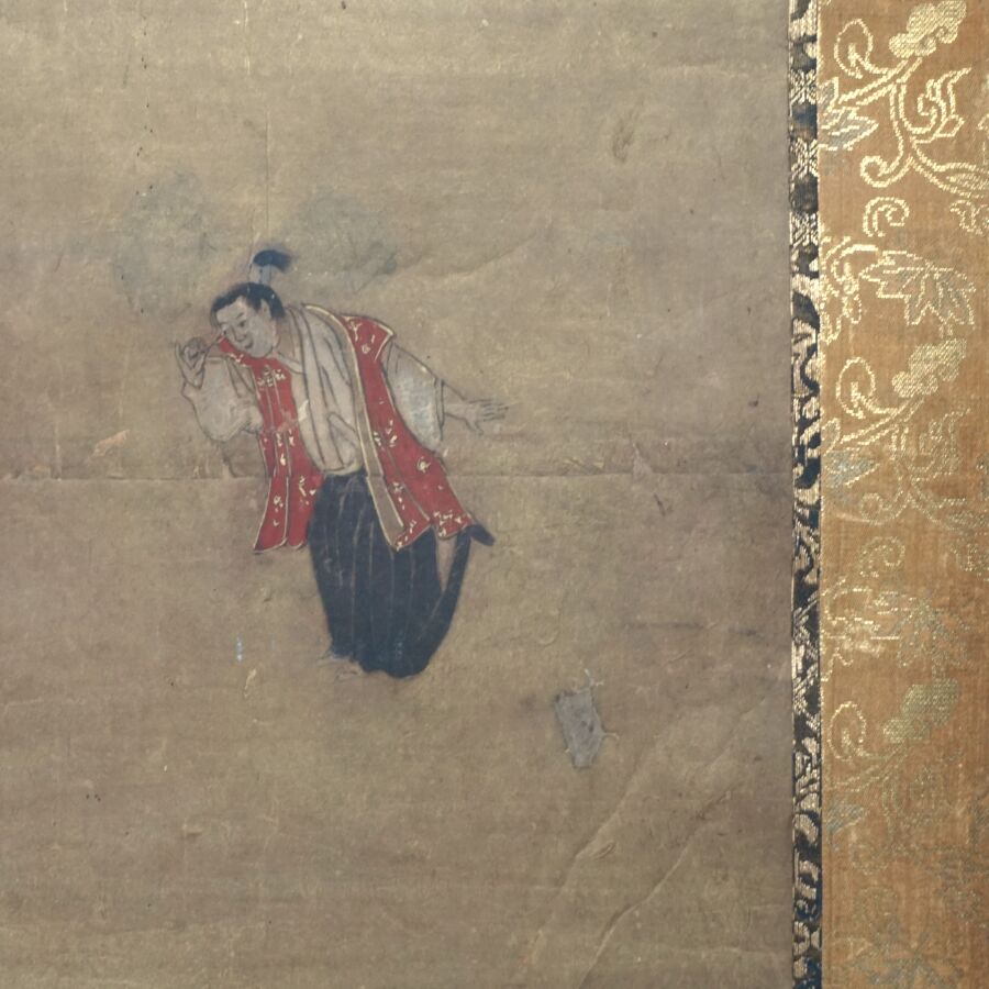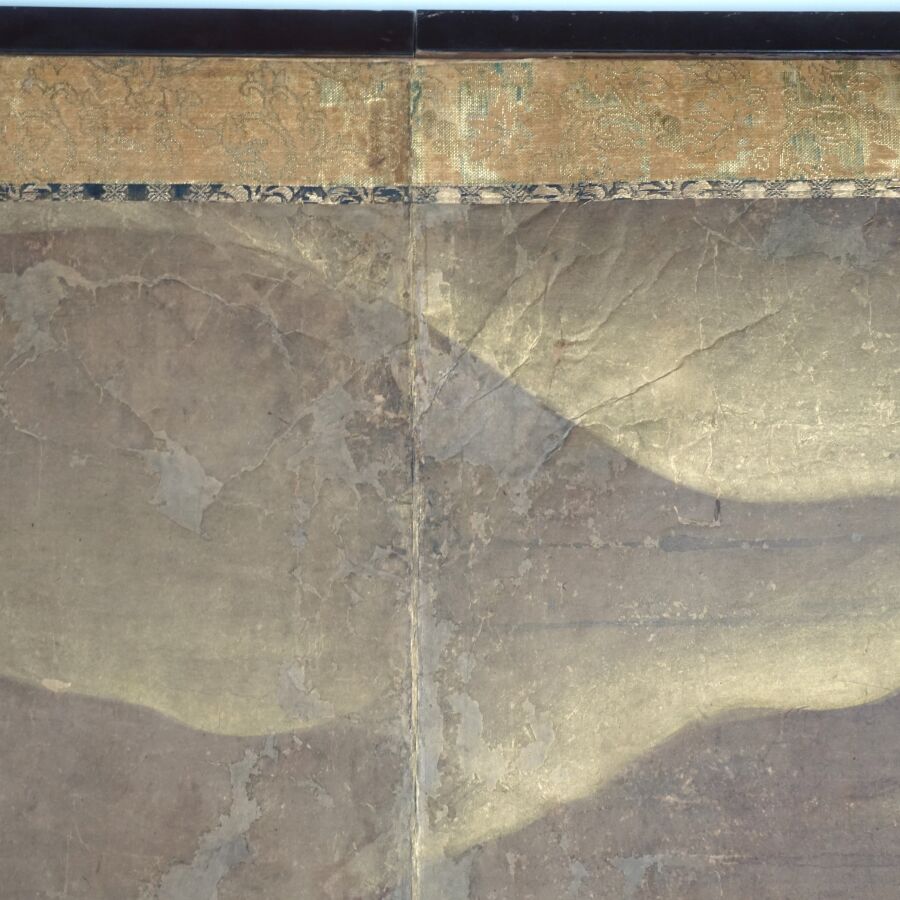 Feuille de paravent à décor polychrome et rehauts d'or sur papier de personnages parmi des fleurs de pivoines et montagnes, Japon, 17ème siècle, 91.5 x 131 cm (usures, taches).