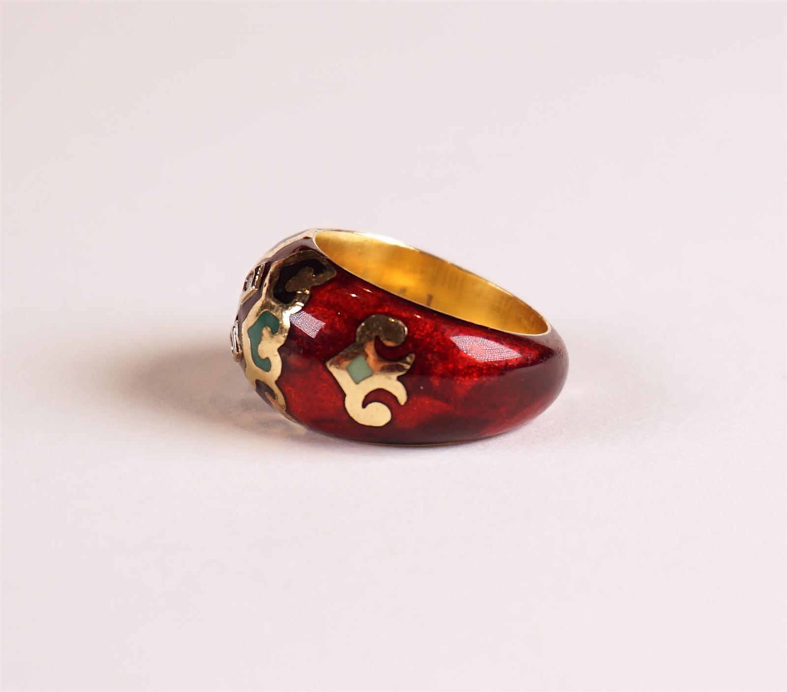 FIDIA GIOIELLI : Bague "Jonc" en or jaune 18 K (750/oo) le corps recouvert d'émail rouge présente au centre deux petits diamants sertis clos dans un décor d'arabesques en or et en émaux polychromes, signée. TDD 54.5. Poids brut : 11.63 g environ (petits manques à l'émail en partie inférieure de l'anneau)