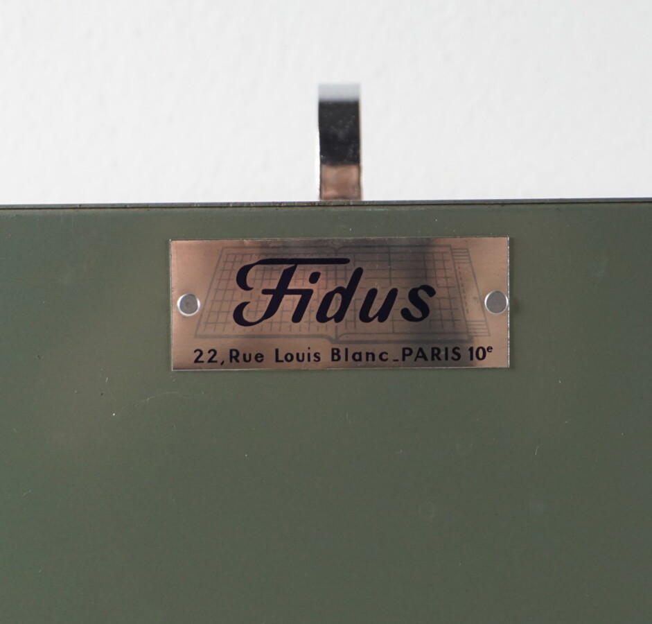 FIDUS : Casier pour classement en métal laqué vert, ouvrant par le dessus et dégageant un casier avec séparation mobile, avec une plaque dessus, circa 1960, H. 37.3 x L. 37.3 x P. 30 cm (avec sa clé, rayures, petites usures).