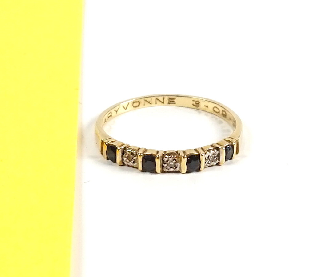 Fine bague en or de 2 tons 18K (750/ooo) sertie de quatre petits saphirs alternés de 3 éclats de diamant (gravée à l'intérieur). TDD 55. Poids brut : 1.75 g environ.
