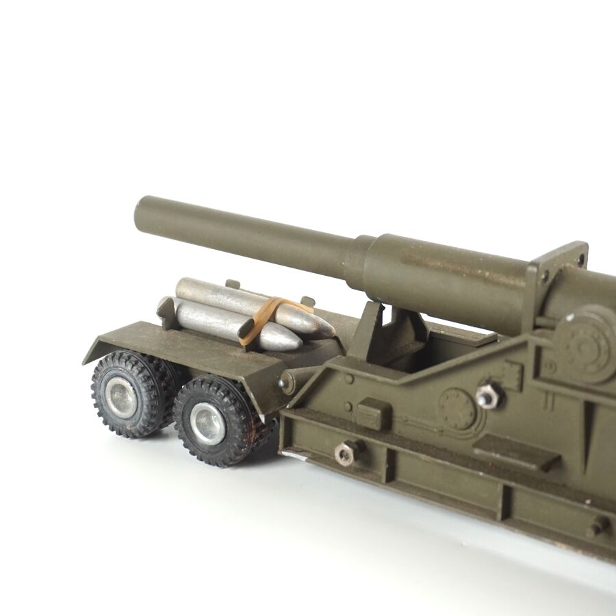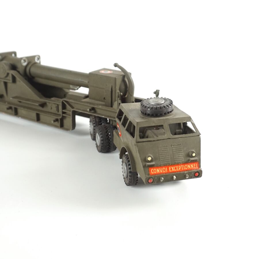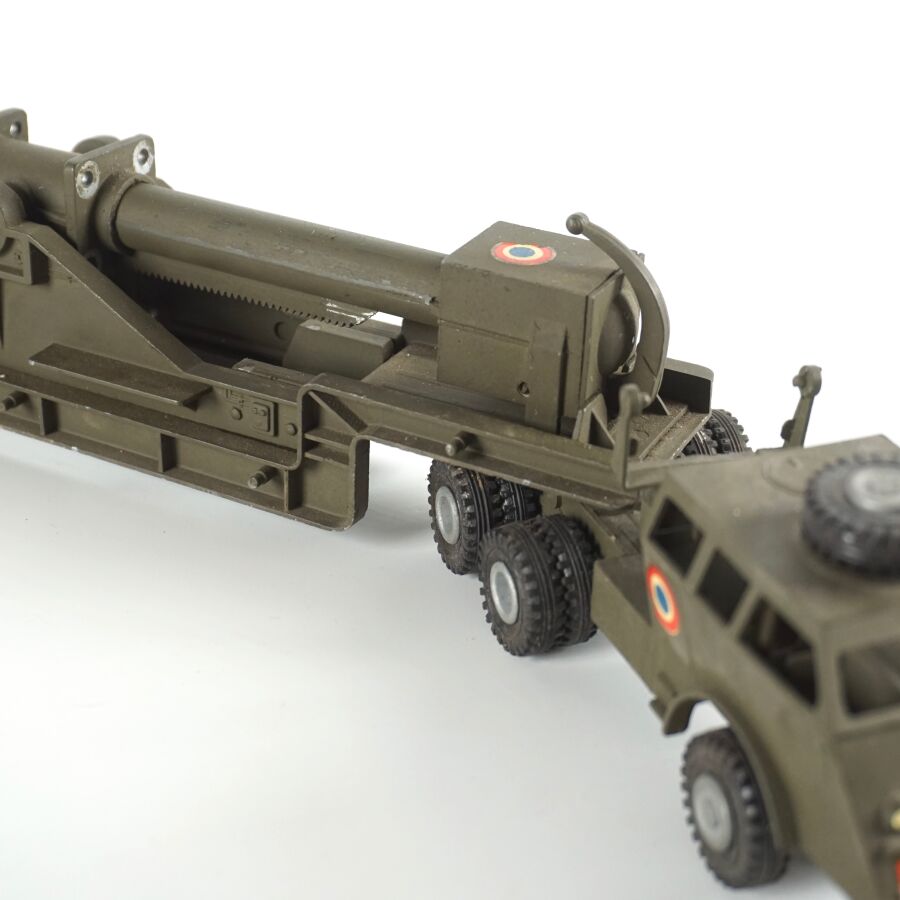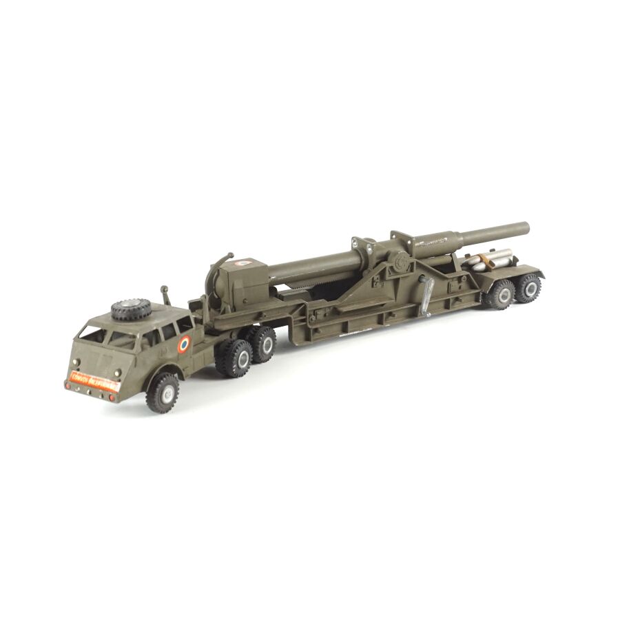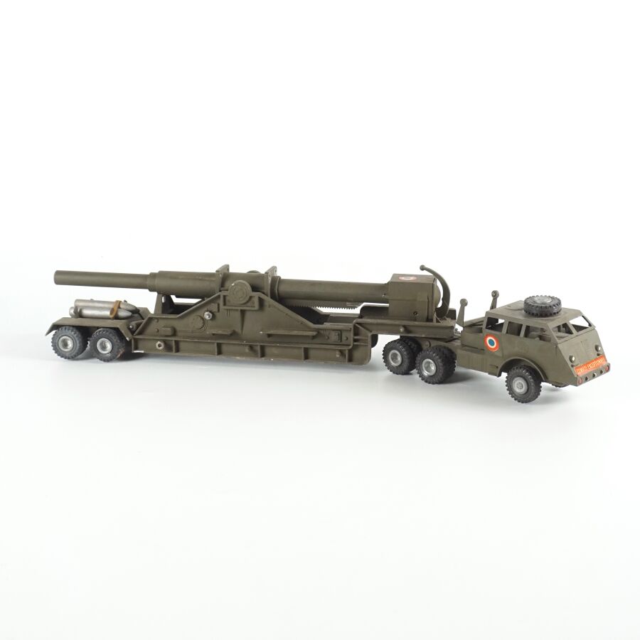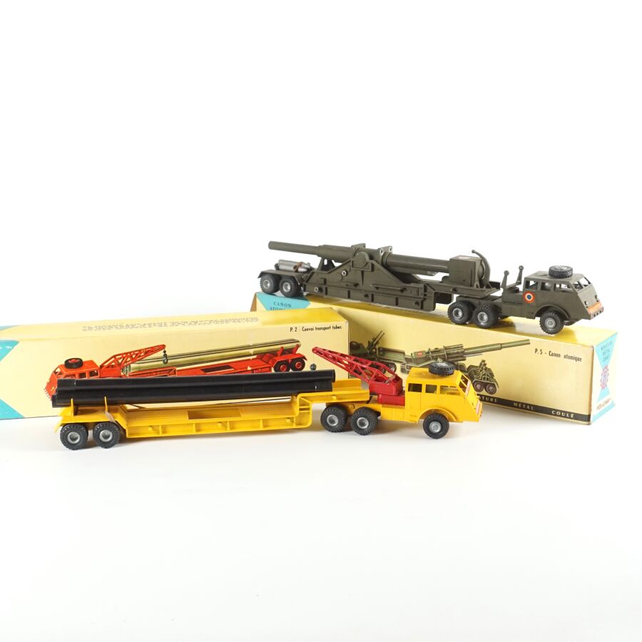 FJ : Deux véhicules, échelle 1/43ème, comprenant (1) Canon atomique P.5, métal coulé (sans personnages mais avec missiles) et (1) Convoi transport tubes, orange, avec 4 tubes, dans leurs boîtes d'origine (bel état, quelques usures aux boîtes, petites traces et usures).