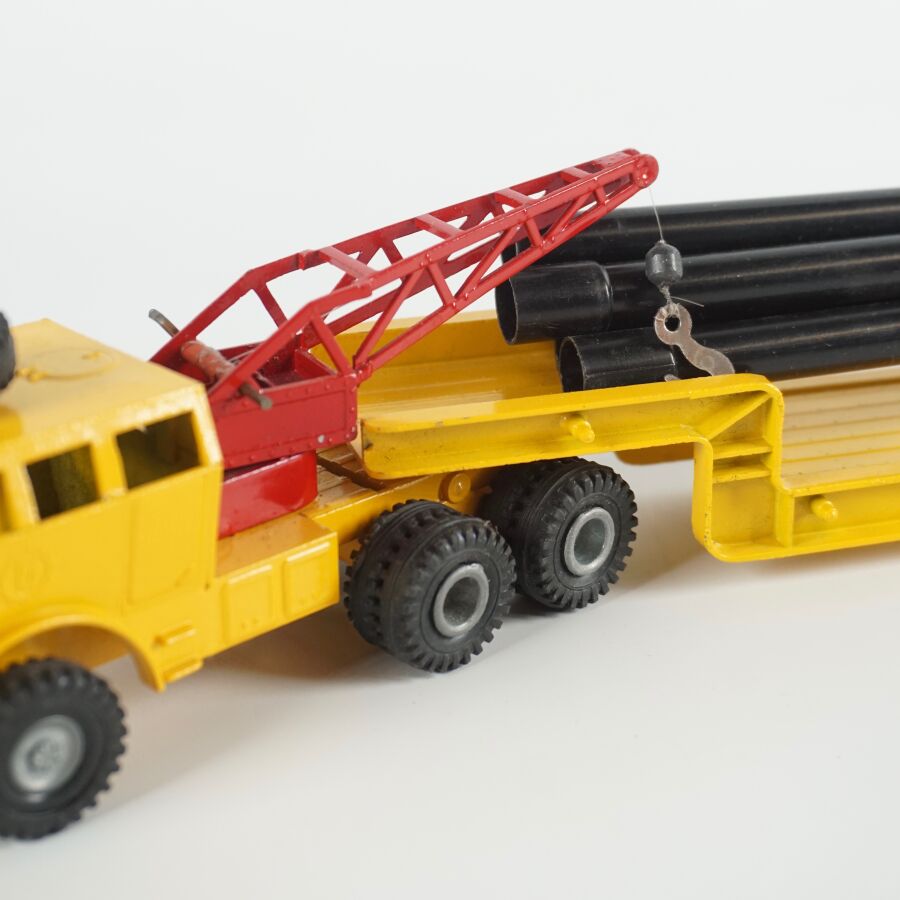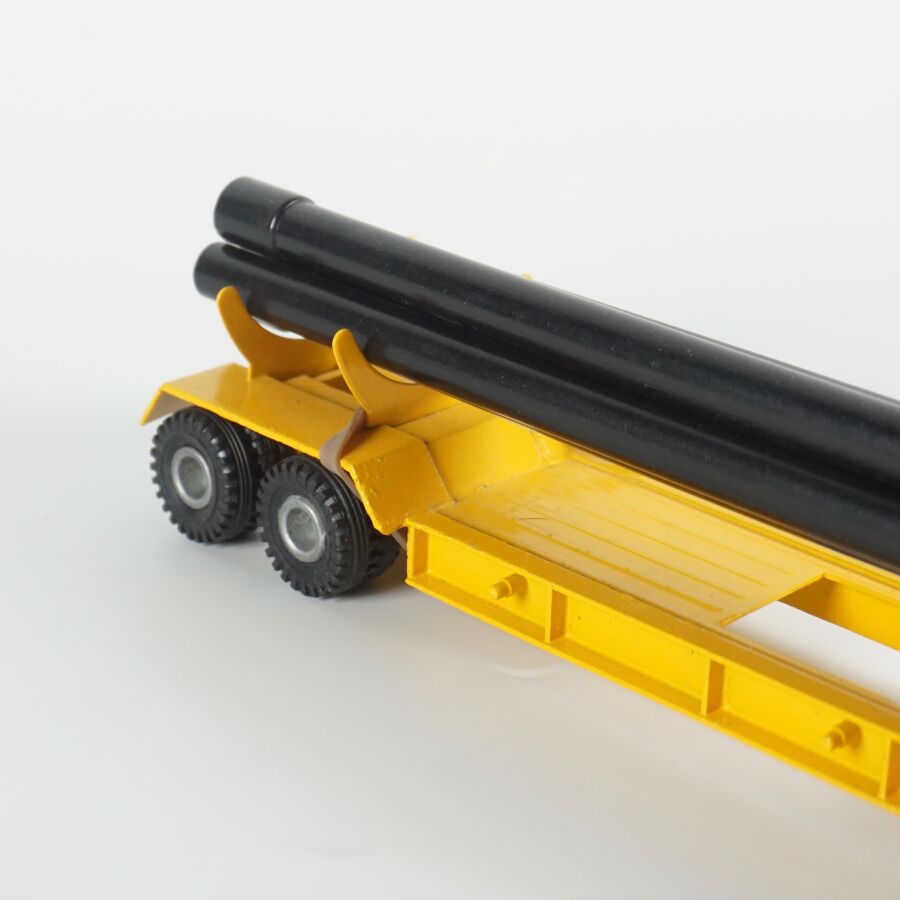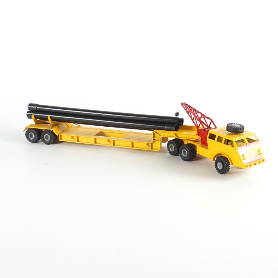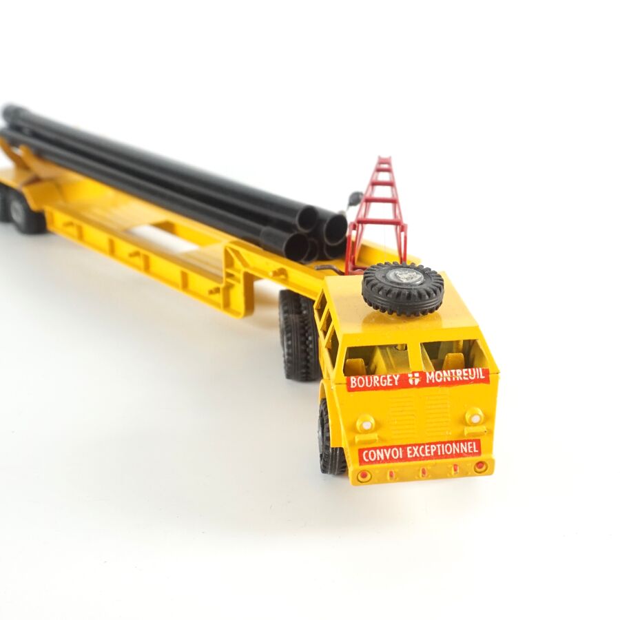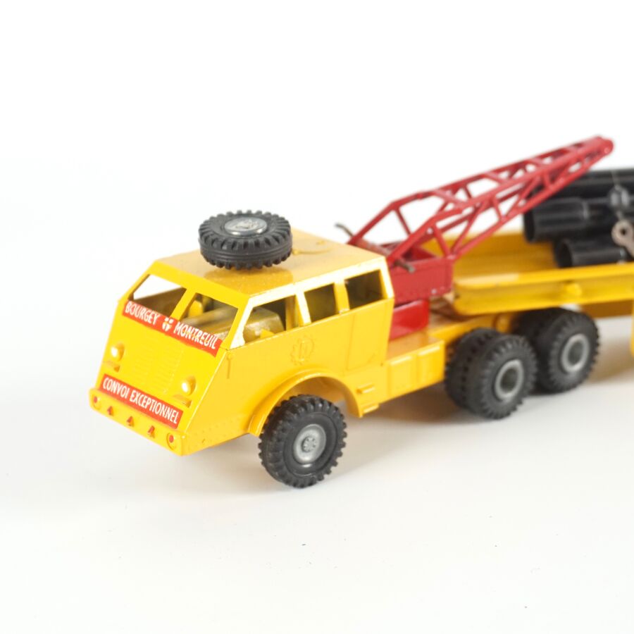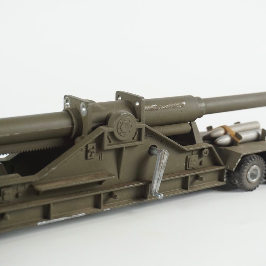 FJ : Deux véhicules, échelle 1/43ème, comprenant (1) Canon atomique P.5, métal coulé (sans personnages mais avec missiles) et (1) Convoi transport tubes, orange, avec 4 tubes, dans leurs boîtes d'origine (bel état, quelques usures aux boîtes, petites traces et usures).