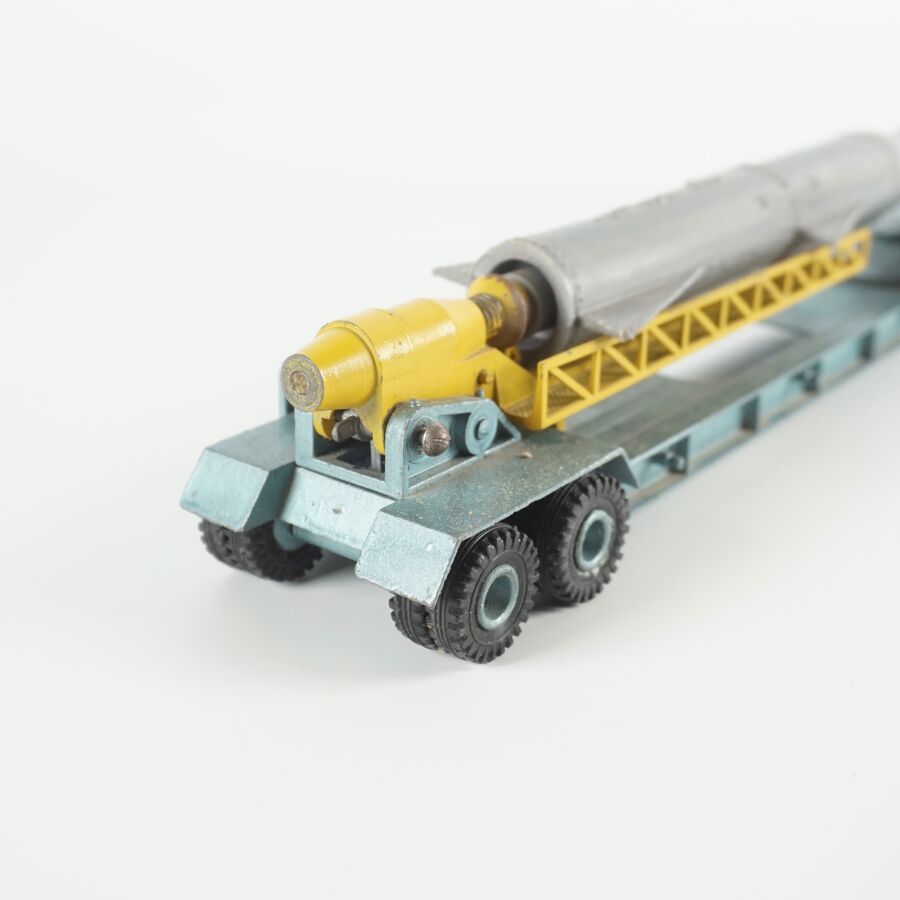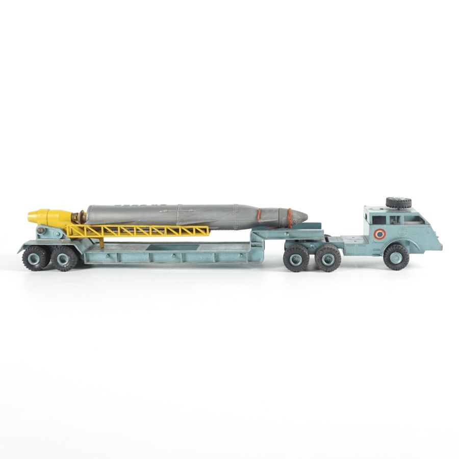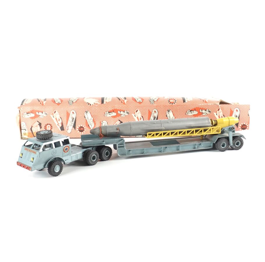 FJ : Tracteur et semi-remorque, bleu métallique, lance fusée gris et jaune, cabine marquée Convoi Exceptionnel, présenté avec sa boîte d'origine (boîte en l'état, déchirure, rayures et infimes traces à la peinture, élastique collé à la tête de la fusée).