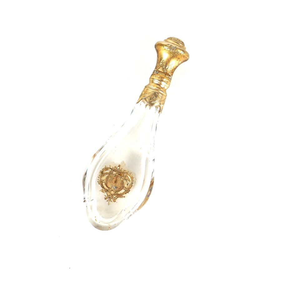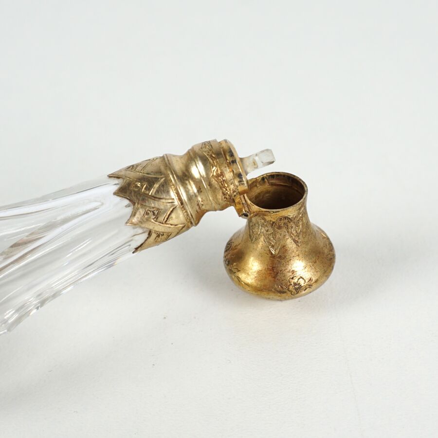 Flacon à sel, verre moulé, monture en vermeil (800/oo) à décor ciselé de frises feuillagées, H. 11.2 cm.