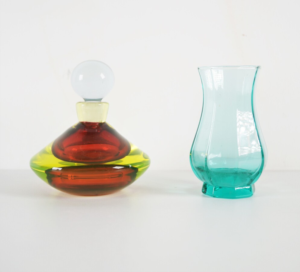Flacon en verre jaune et rouge, le corps à panse aplatie avec son bouchon, dans le goût de Murano, H. 11 cm. On joint un petit vase en verre teinté vert-bleu de forme balustre à pans coupés, H. 10 cm.