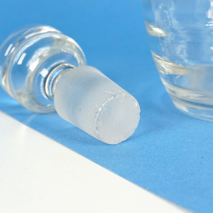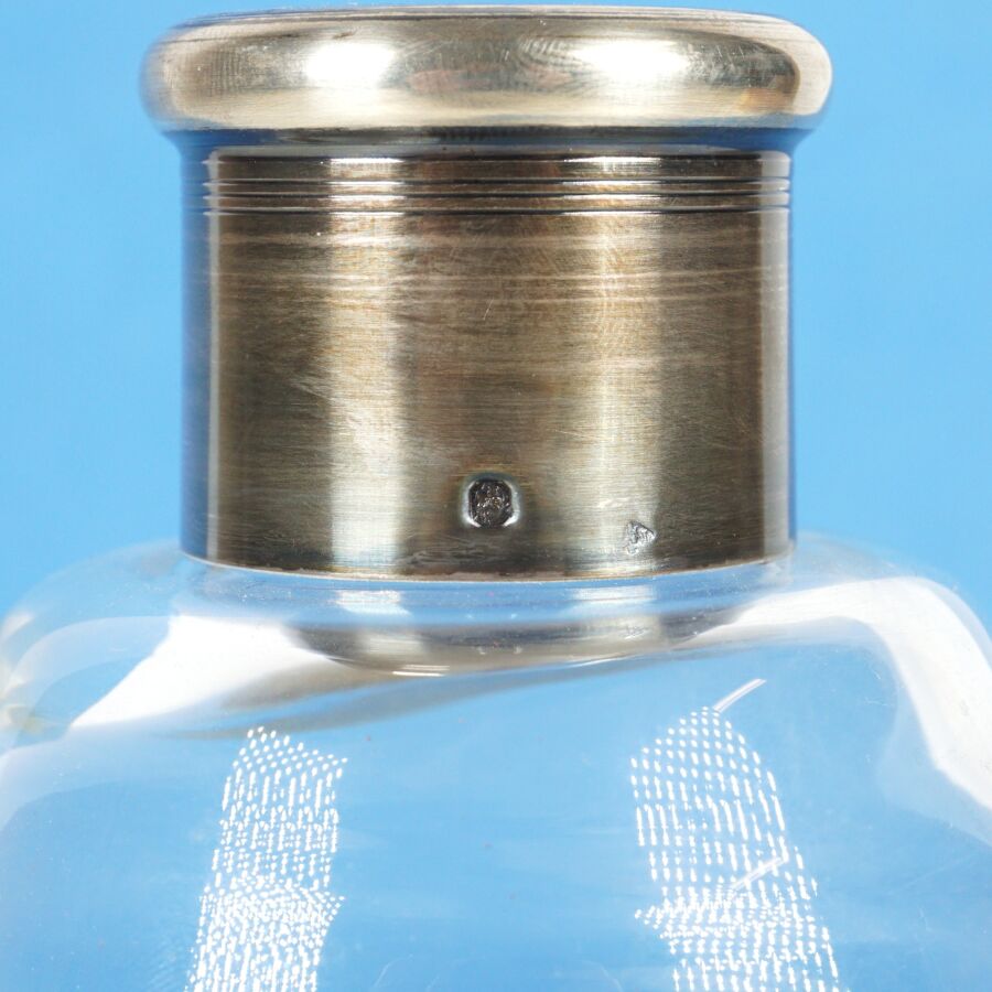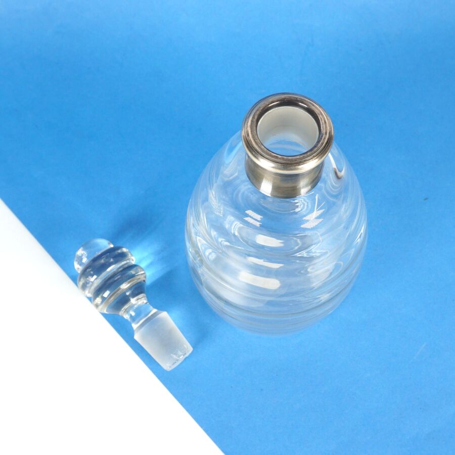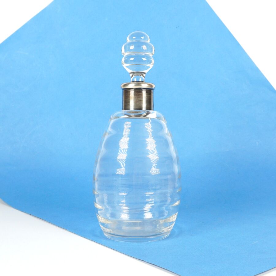 Flacon en verre moulé incolore, monture en argent, poinçon Minerve 1er titre, avec son bouchon, H. 25 cm (éclats au bouchon).