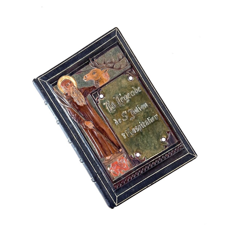 FLAUBERT (Gustave) - La Légende Saint-Julien L'Hospitalier - Paris ; Librairie des Amateurs, A. Ferroud - F. Ferroud, 1912 - 1 volume In-12° - 20 compositions dessinées et gravées in et hors texte par Gaston Bussière - Jolie reliure de l'époque demi-chagrin marine à coins - 1er plat polychrome à double filet d'encadrement doré orné de Saint Julien surmontant 1 diable et entourant 1 cerf de son bras, le tout en relief, titre frappé à froid rehaussé d'or dans cartouche avec pierres blanches serties aux angles - Couvertures et dos conservés - Dentelle intérieure - Dos à nerfs orné et titré or - Tête dorée - Très bon exemplaire numéroté sur vélin teinté (n°270 sur les 811, tirage total : 988 + 12 chine) - Cachet ex-libris armorié à sec au 1er plat de couverture, ex-libris manuscrit à l'1 des gardes blanches : Geneviève de la Sablière.