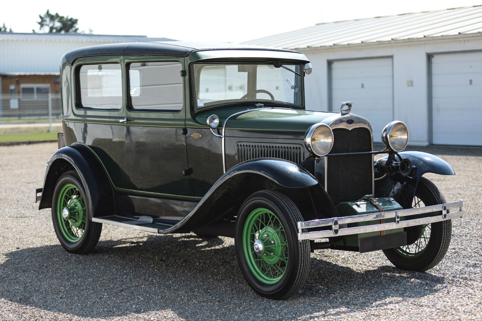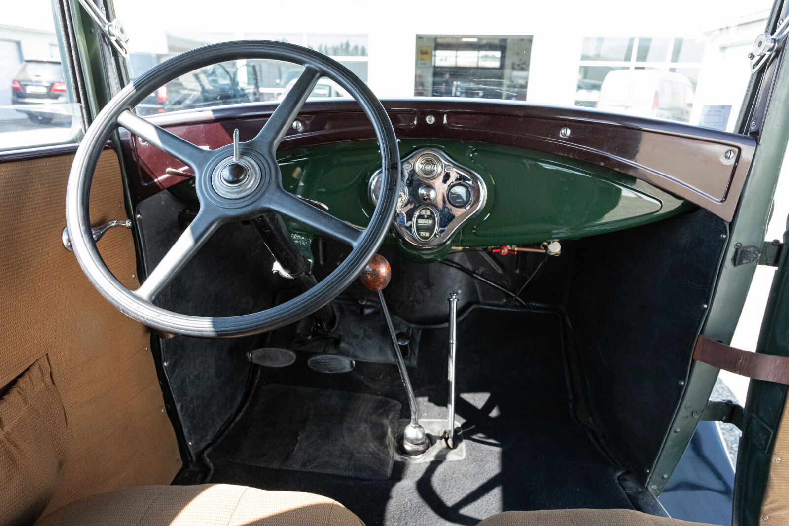 FORD type A de 1928, Coach toit simili, 2 portes 4 places, carte grise française (erreur S/CG 1° mise en circ. 1901) n° de série : 8678, 27218 km au compteur. Carrosserie très saine, peinture de couleur verte et noire. Sellerie feutrine beige, moquettes noires. Moteur 4 cylindres 19 CV, boite 3 vitesses manuelles. Roues à rayons. Calandre et phares chromés. Pare-brise basculant. Roue de secours sur aile gauche. Malle à outils à l'avant et malle de voyage à l'arrière. Mascotte sur radiateur. Belle restauration en bon état de marche.