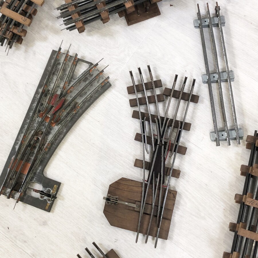 Fort ensemble de rails courbes et droits divers, bois et métal (usures).