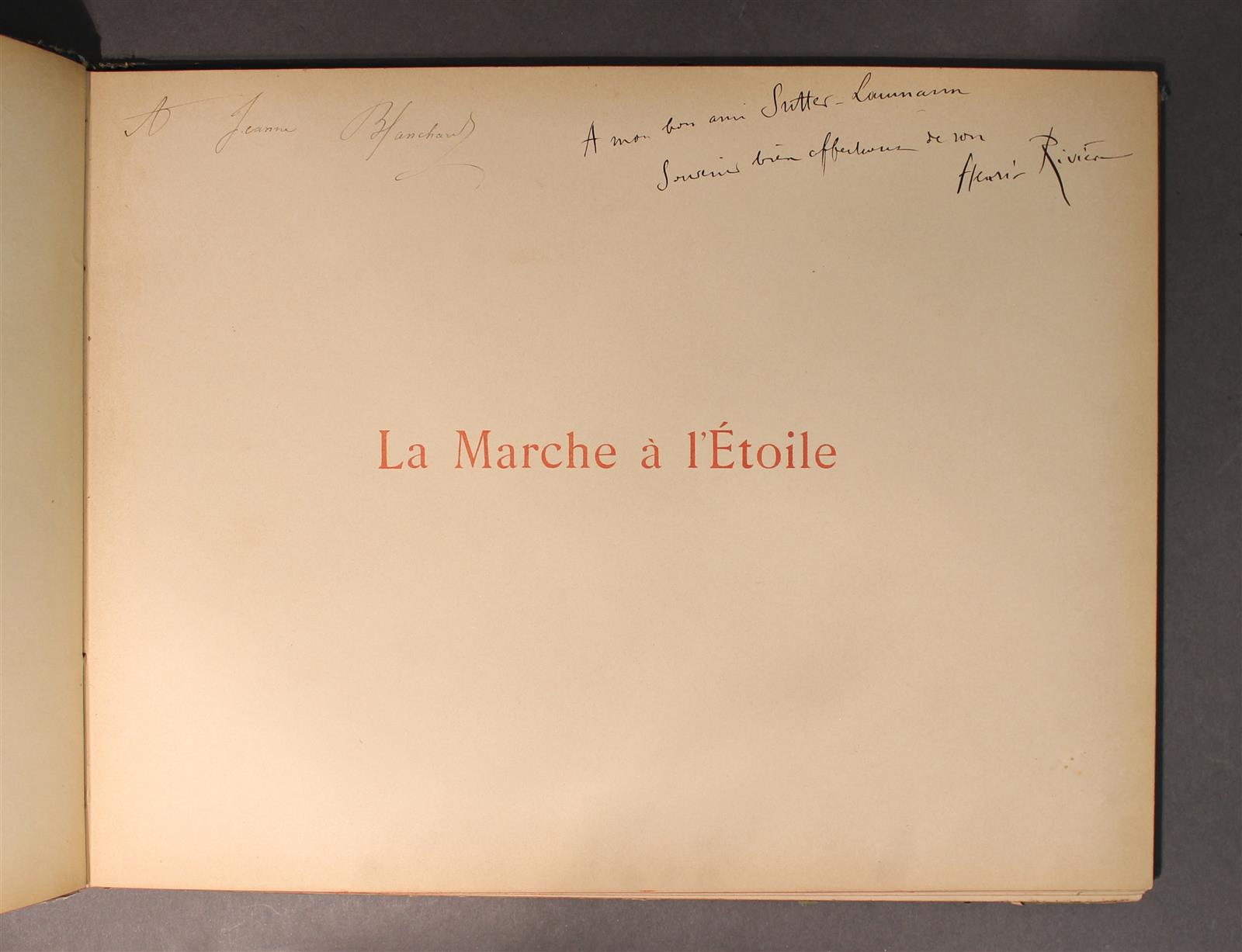 FRAGEROLLE (Georges) - La marche à l'étoile - Mystère en 10 tableaux - Paris ; Enoch Frères & Costallat, C. Marpon & E. Flammarion, sans date [1899] - 1 volume In-4° oblong - 3 illustrations couleurs in-texte et 15 à pleine page par Henri Rivière - Reliure éditeur cartonnage illustré couleurs et titré au 1er plat (mors et coupes frottés, coiffes usées avec petits manques, coins légèrement usés) - Tranches rouges - Bon intérieur - Ouvrage enrichi d'1 envoi autographe signé de Henri Rivière au faux titre à l'encre noire : " A mon bon ami Sutter-Laumarm, Souvenirs bien affectueux de son Henri Rivière " - Ex-dono d'1 écriture différente sur la même page : " A Jeanne Blanchard " - Bon exemplaire.