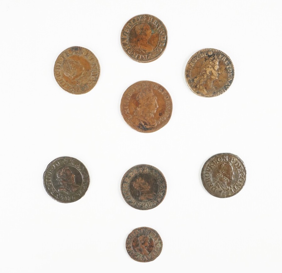 FRANCE DIVERS : Lot de 8 monnaies de cuivre : Louis XIII Denier Tournois 1615 A, Double Tournois : Henri III 1578 A, Henri IIII 1607 A, Louis XIII 1628 A, François de Bourbon Conti, Henriette de Lorraine principauté de Phalsbourg et Lixheim 1633, Liard : Louis XIV 1656 A et 1698 P (Dijon), TTB.