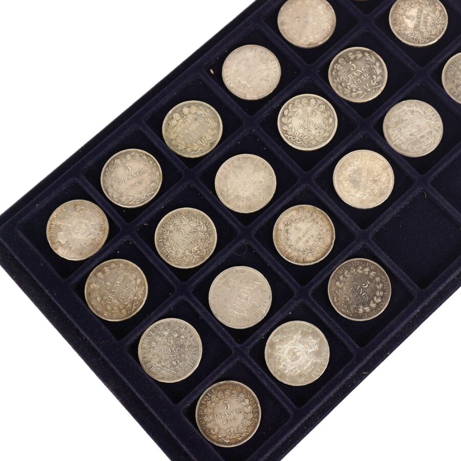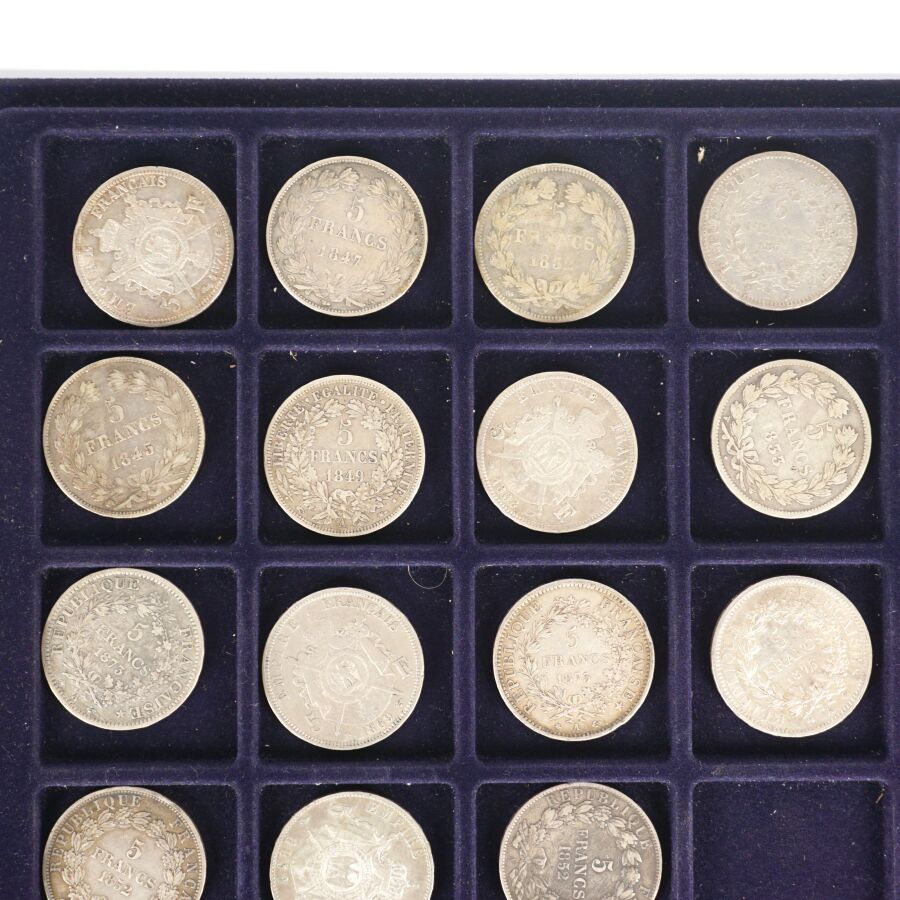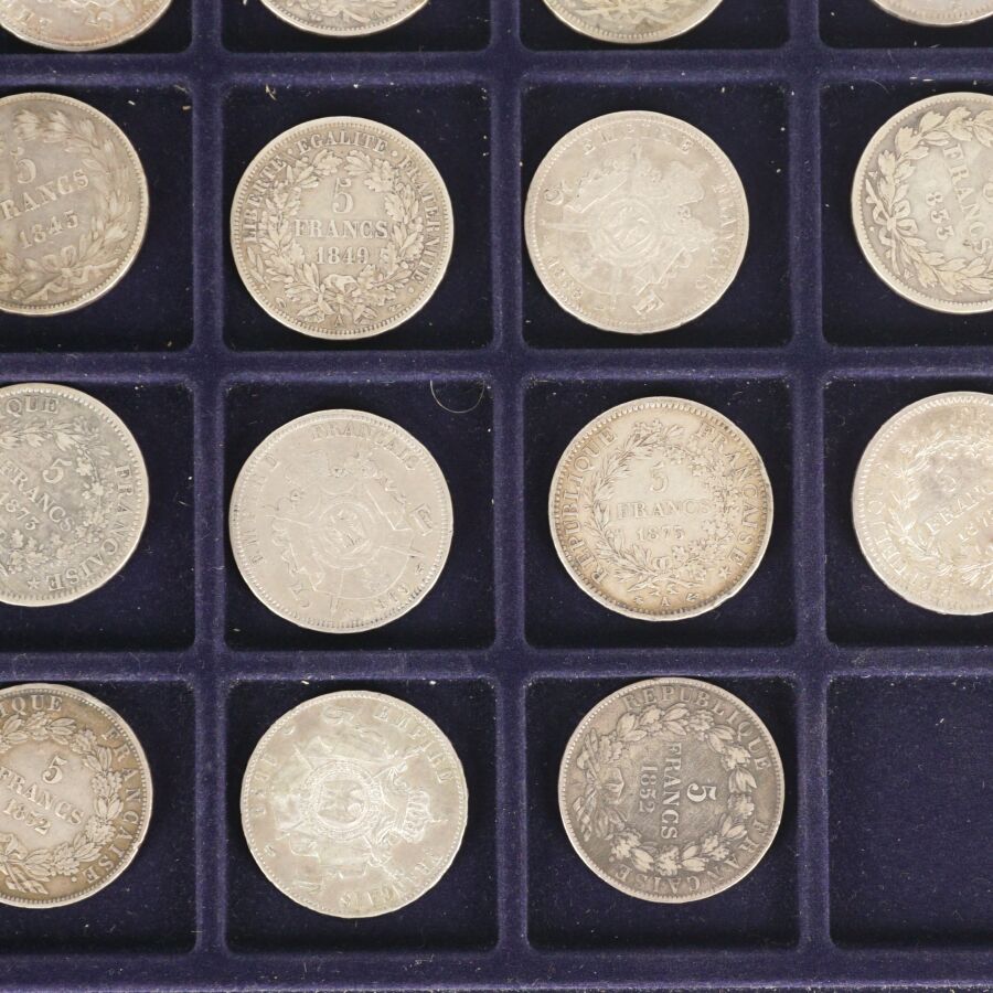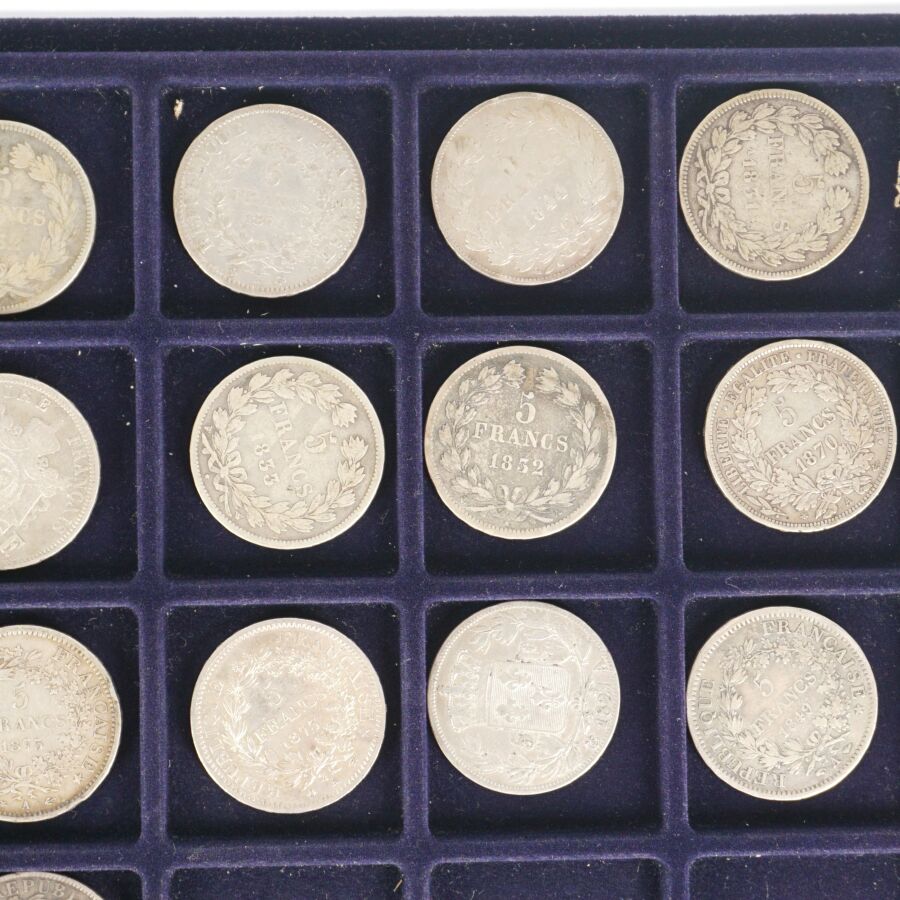 FRANCE : Ensemble de 21 écu de 5 Frcs Argent dont : Charles X 1827 A, Louis Philippe 1er 1831 A/, Louis Napoleon Bonaparte 1852A et 1856A/ 32T/ 32A/ 33W/ 44A/ 45W/ 47A, Napoléon III 1868A/ 69BB/ 70A, Cérès 1849 A et 1870 A, Hercule 1849 A, 1873 A, 1874 K, Poids brut : 518 g environ.