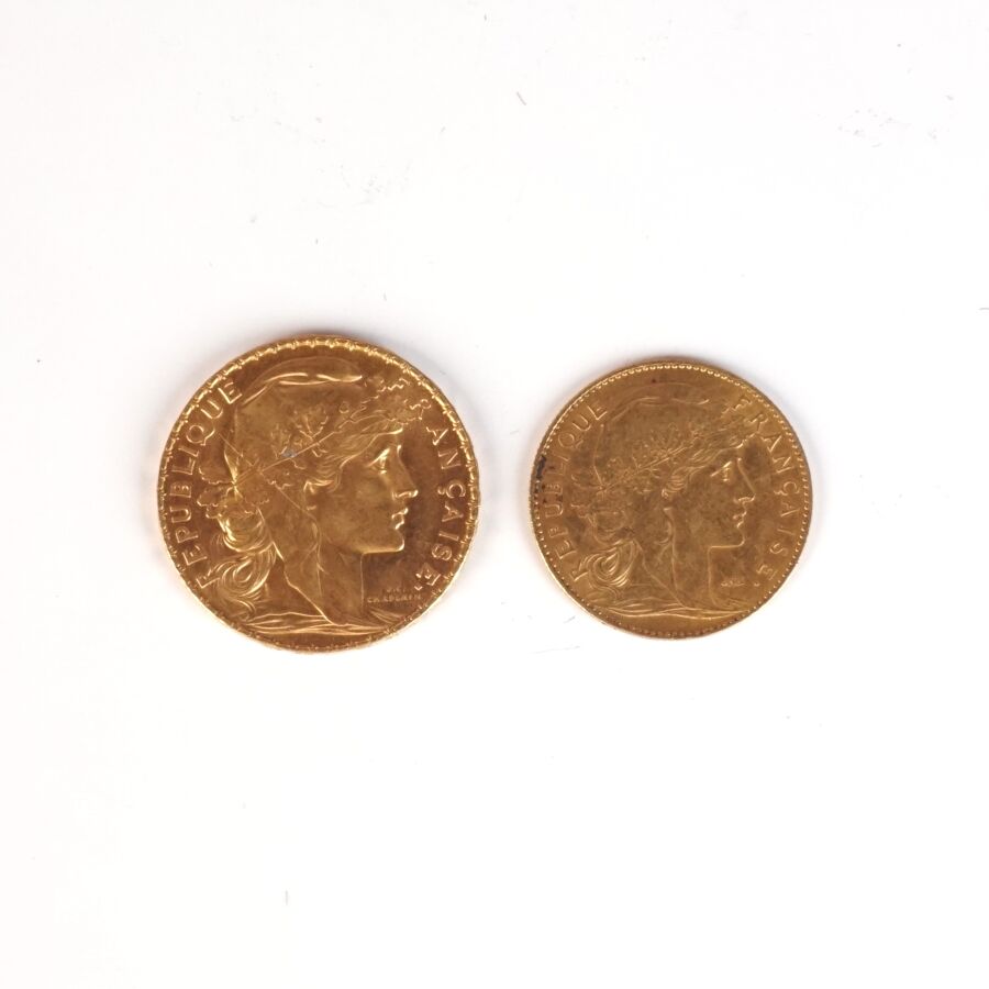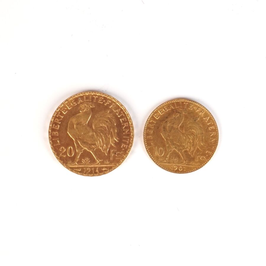 FRANCE : Lot de 2 monnaies Or comprenant 20 Frcs Coq 1914 et 10 Frcs Coq 1901, Poids brut : 6,43 g et 3,22 g environ.