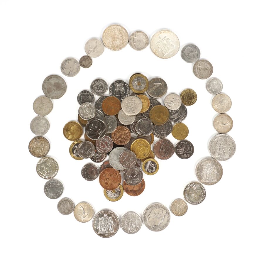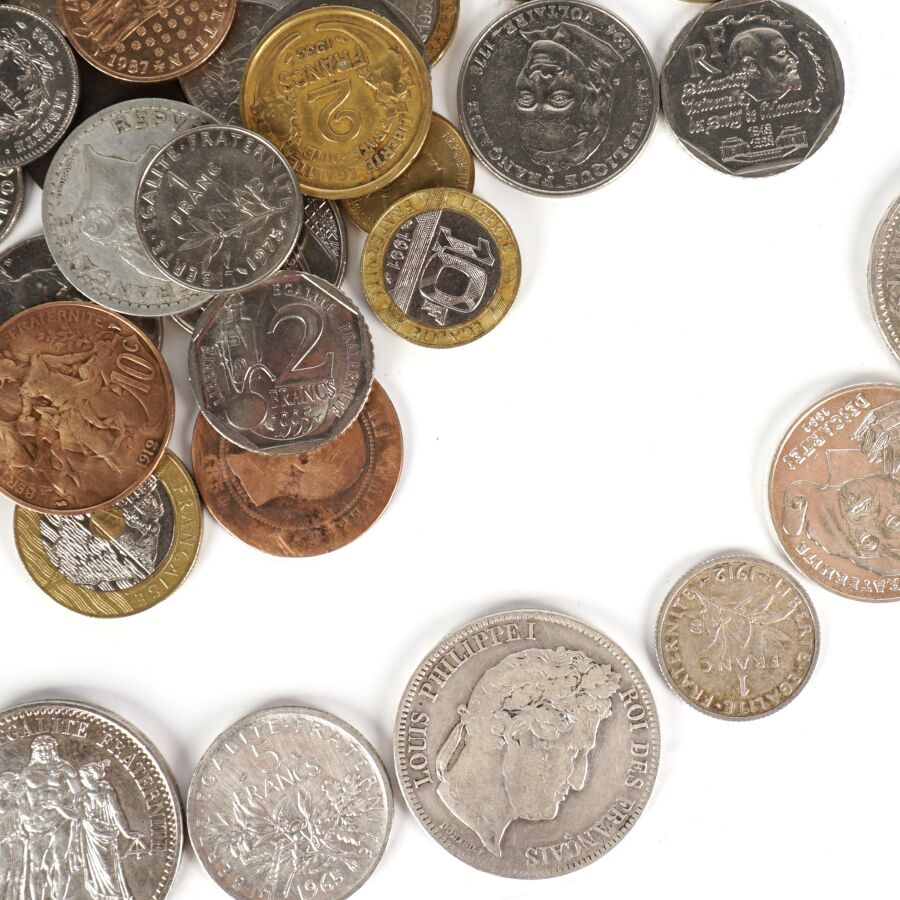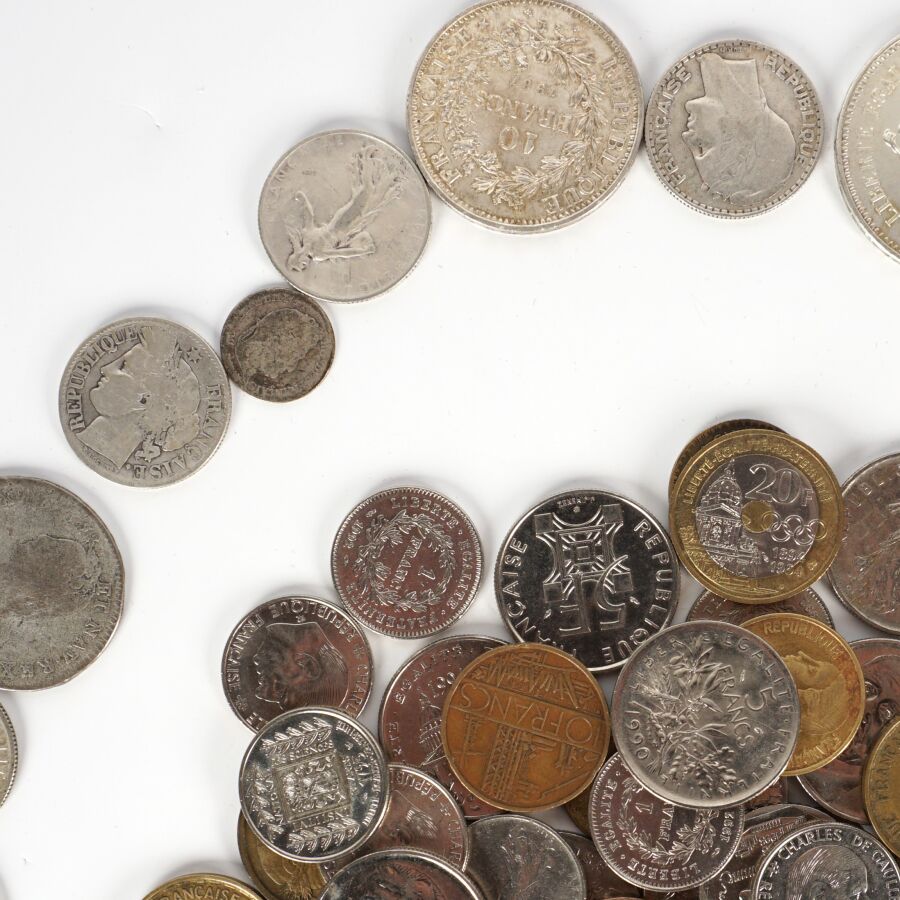 FRANCE : Lot de 26 monnaies, certaines en argent, différents titres, du 18 au 20ème siècles et divers modernes dont : Demi écu de Louis XV 1727 BB, 1 et 2 Frcs Napoléon III, Cérès et Semeuse, 5 Frcs Louis Philippe 1er 1841 W, 10 et 50 Frcs Hercule, 100 Frcs Descartes x2, Poids brut : 345 g environ.