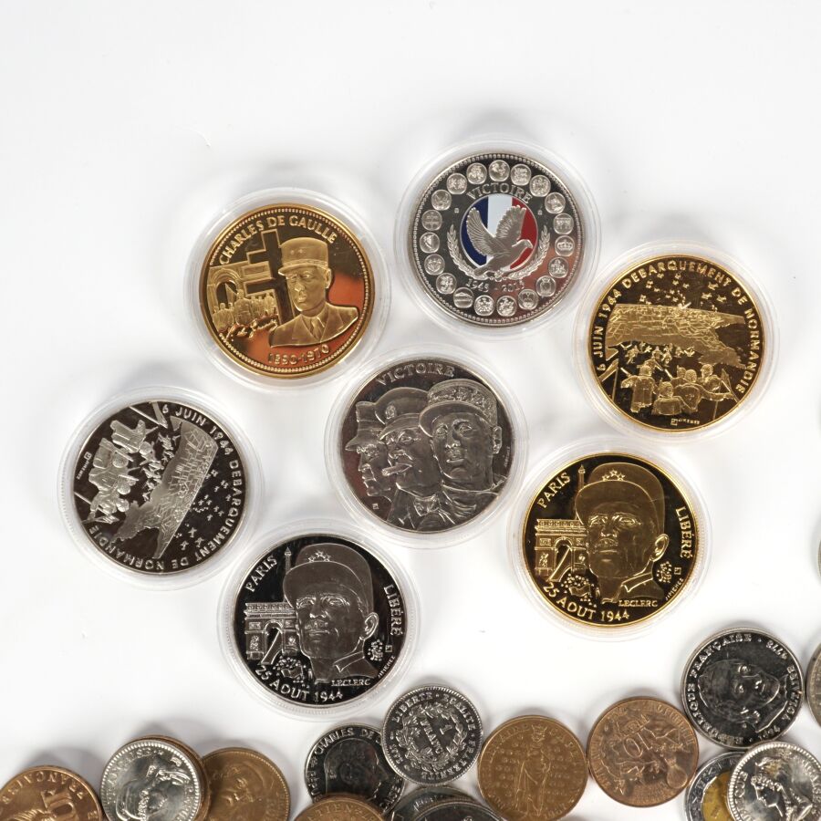 On y joint 7 médailles dont De Gaulle, Débarquement de Normandie, Paris libéré, Victoire et L'Europe des XXVIII 2015 Essai.