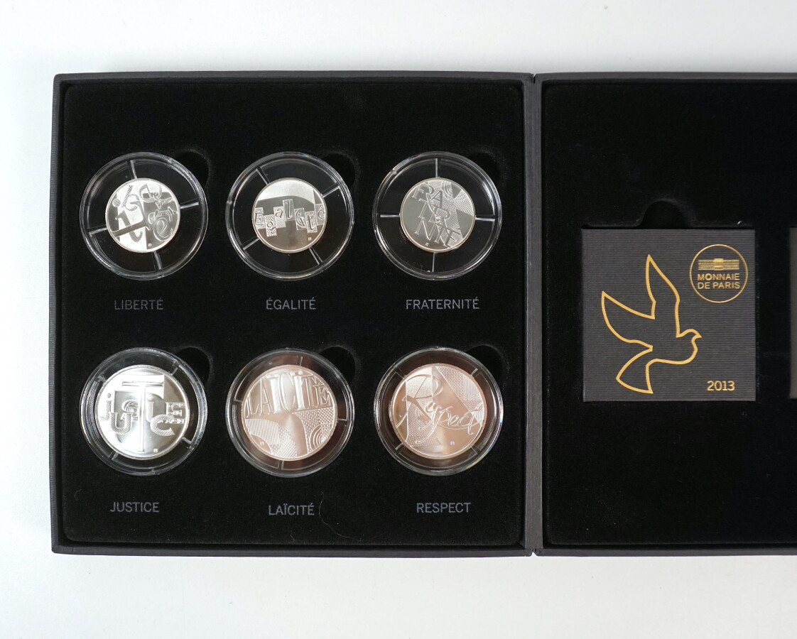 FRANCE - MONNAIE DE PARIS : Coffret "Les Valeurs de la République" 2013, comprenant 6 monnaies en argent, 3 x 5 € et 3 x 25 €.