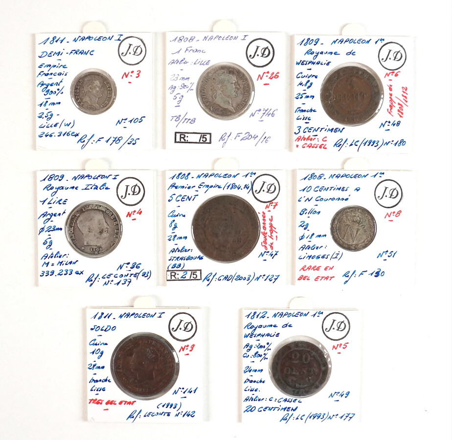 - FRANCE : 5 centimes Strasbourg 1808, 10 centimes Limoges 1808, 1/2 Franc argent 1811W, 1 Franc argent 1808W