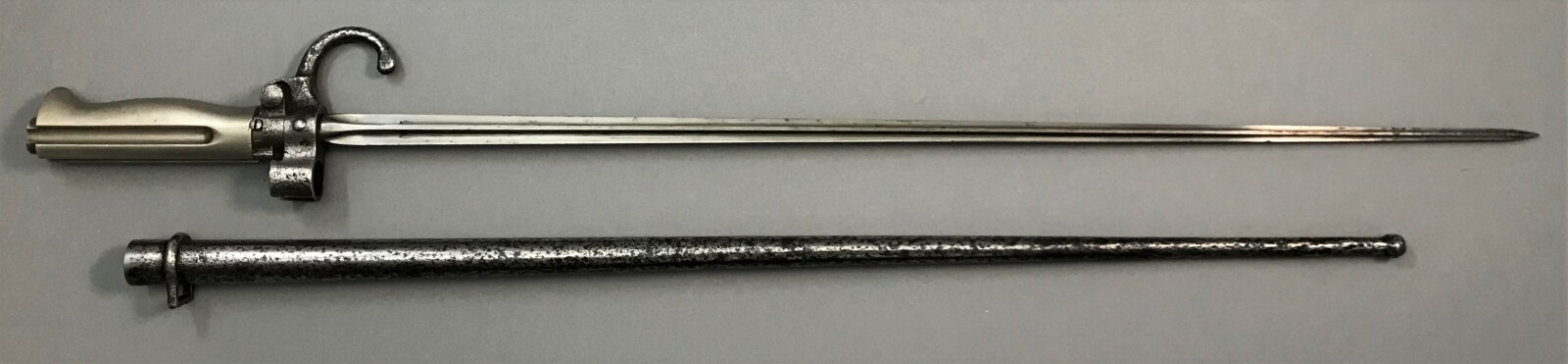 FRANCE - Rare EPEE-BAIONNETTE MODELE 1895 D'ESSAI dite DAUDETEAU, poignée en maillechort comportant une longue rainure longitudinale, croisière piquée à quillon recourbé, belle lame de section cruciforme à pans évidés, fourreau piqué, ABE. (ABC1453)