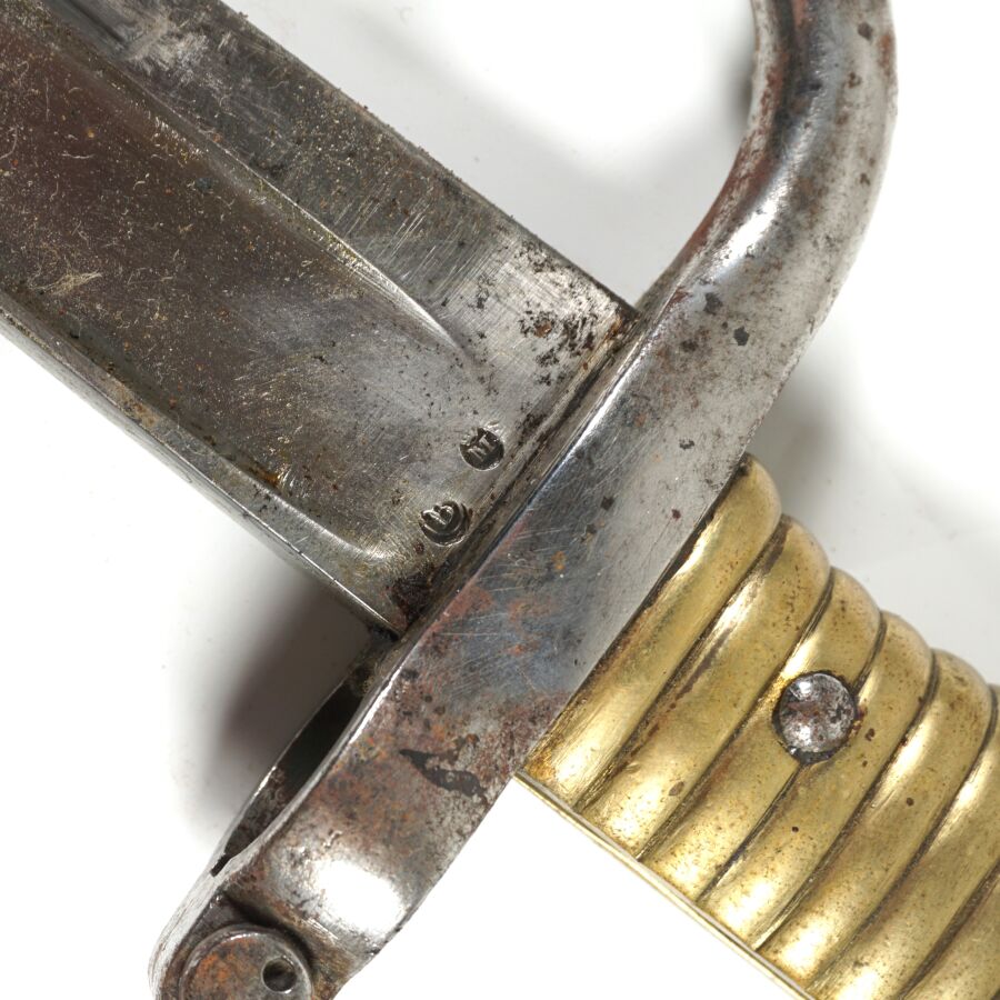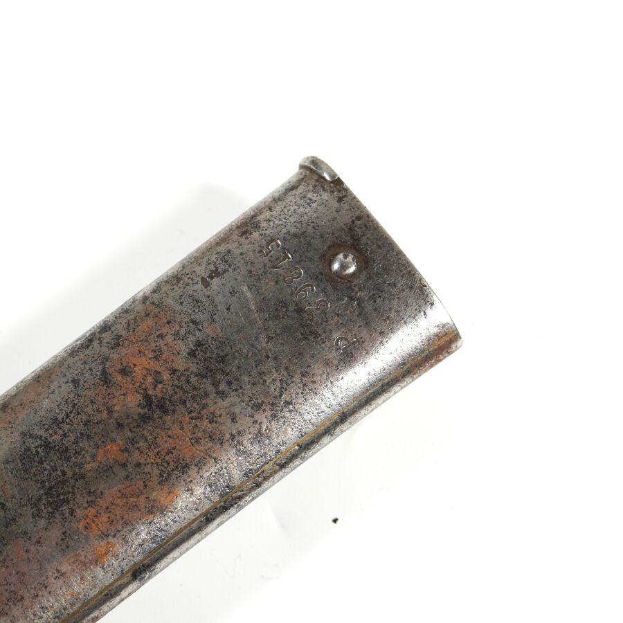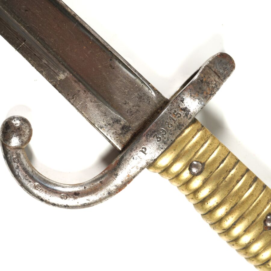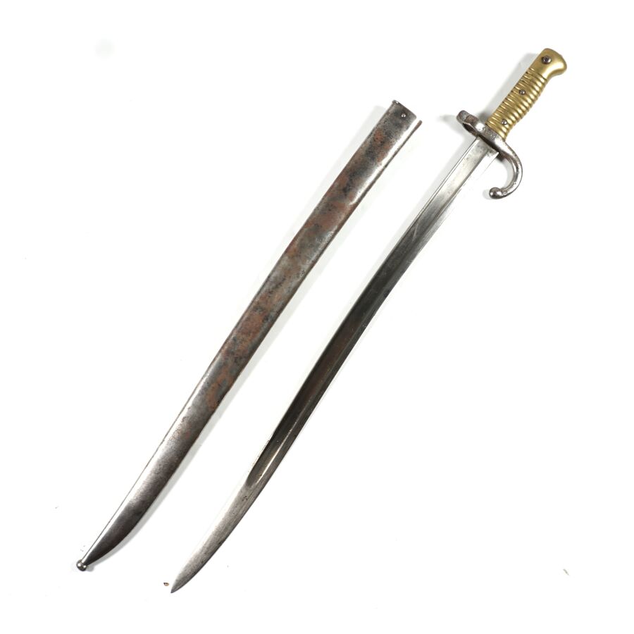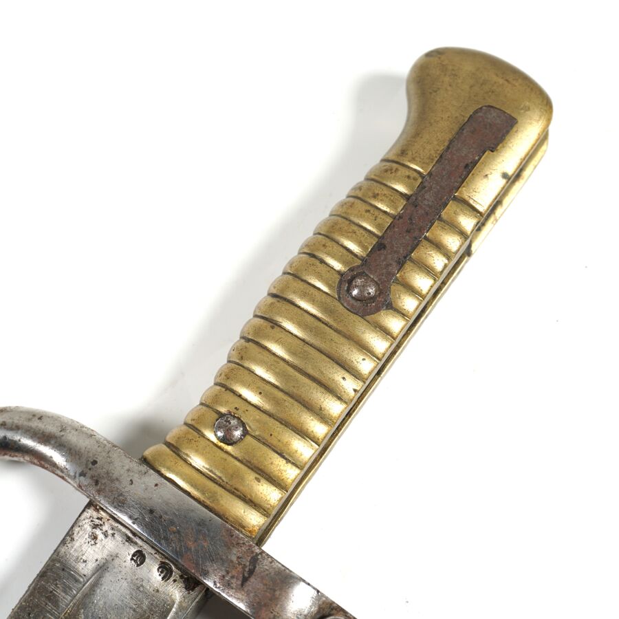 FRANCE - SABRE-BAIONNETTE MODELE 1866 dit CHASSEPOT, poignée cannelée en laiton, croisière piquée en acier à quillon recourbé, lame yatagan légèrement piquée marquée " Saint Etienne 8bre 1872 ", fourreau piqué en acier au même numéro que la croisière, EM/ABE.
