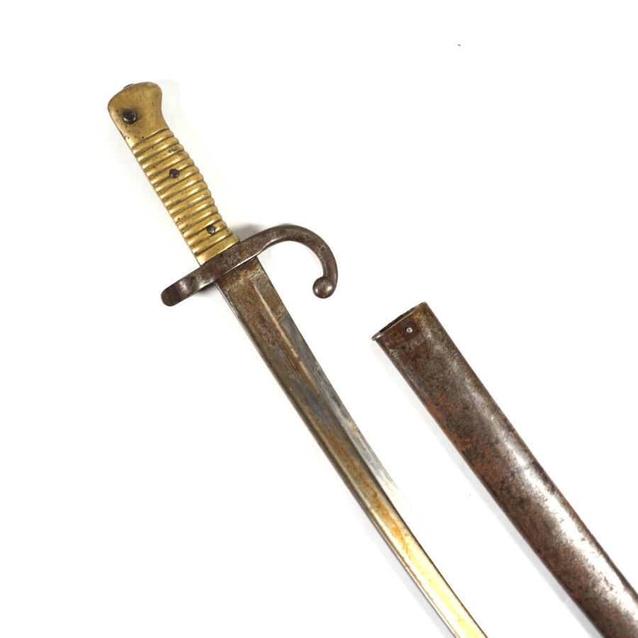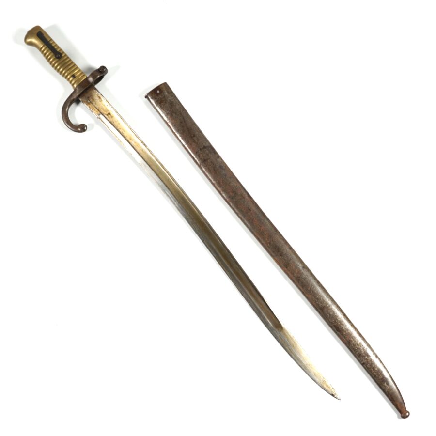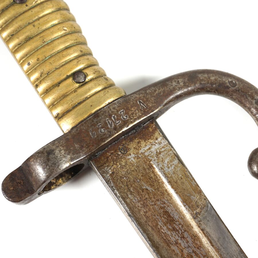 FRANCE - SABRE-BAIONNETTE MODELE 1866 dit CHASSEPOT, poignée cannelée en laiton, croisière en acier à quillon recourbé matriculée " V27121 ", lame yatagan à dos plat dépourvue de marquages, fourreau piqué en acier au même numéro de matricule à nettoyer (manque anneau), ABE.