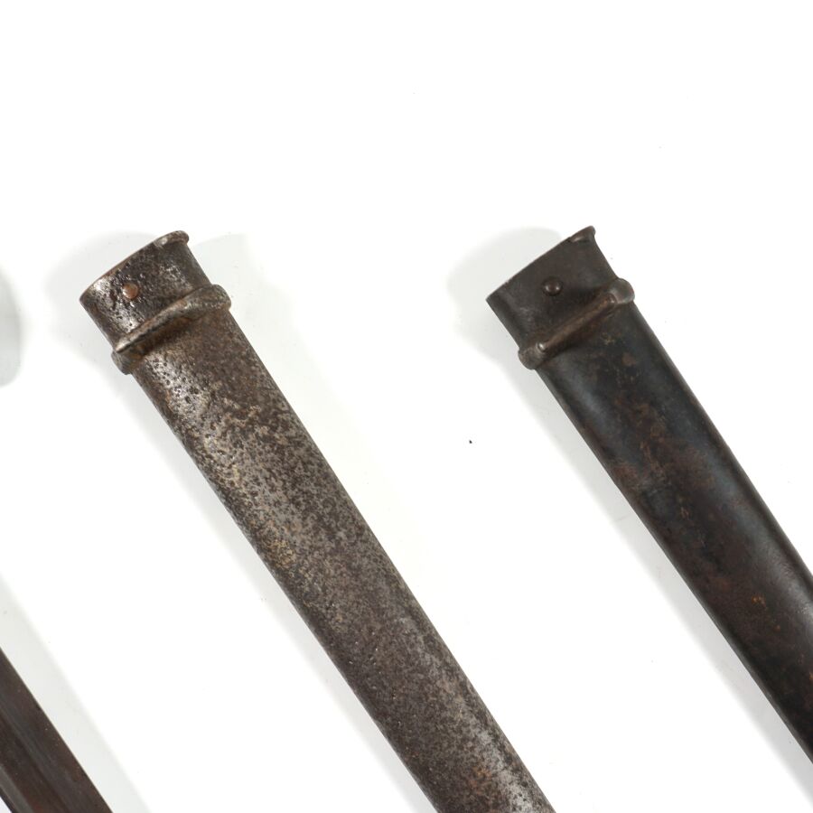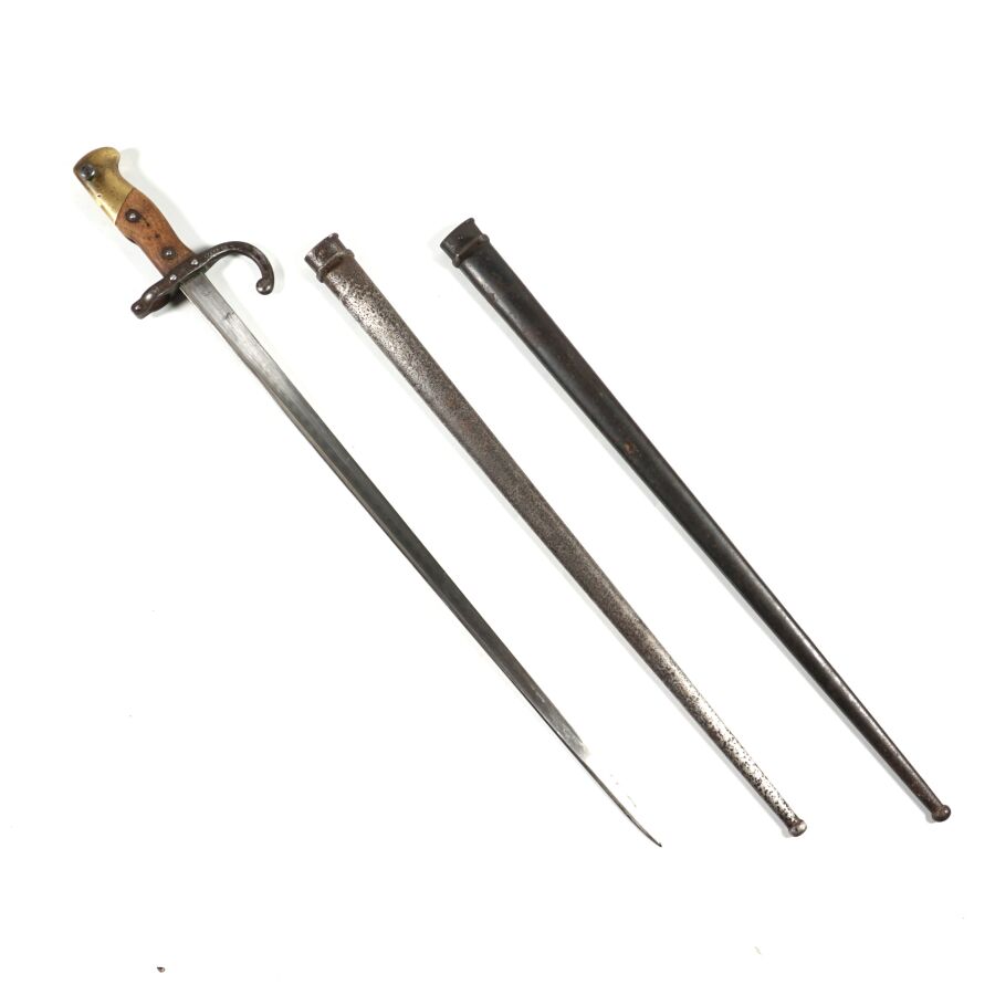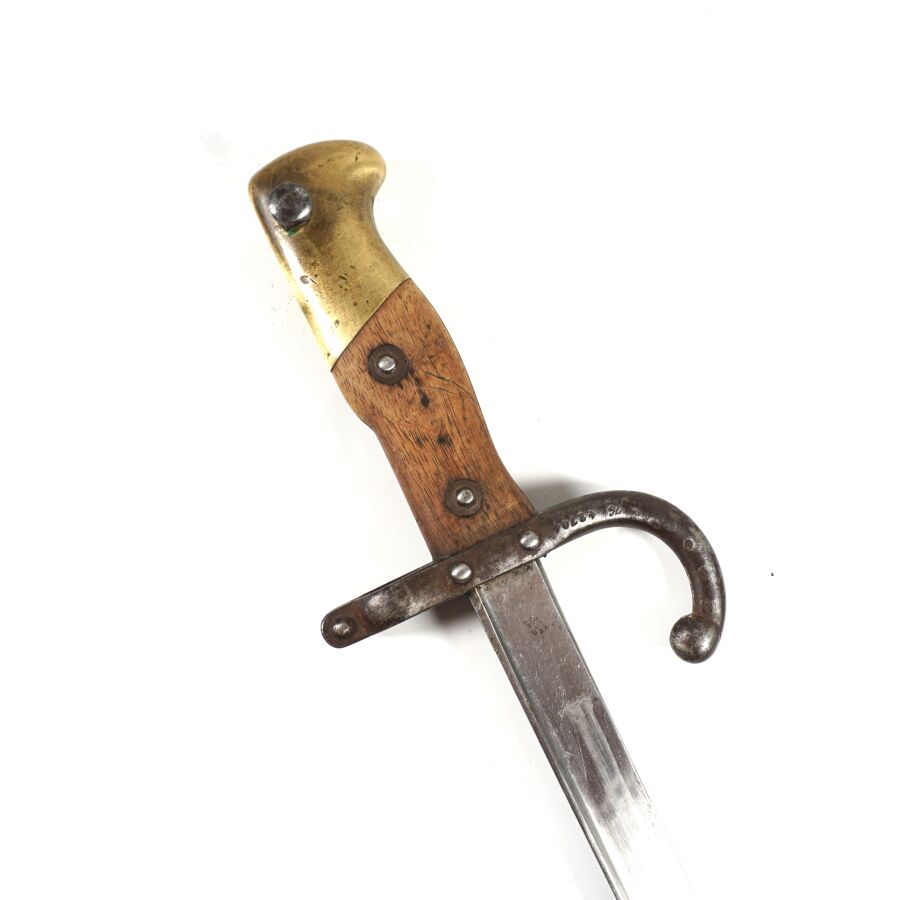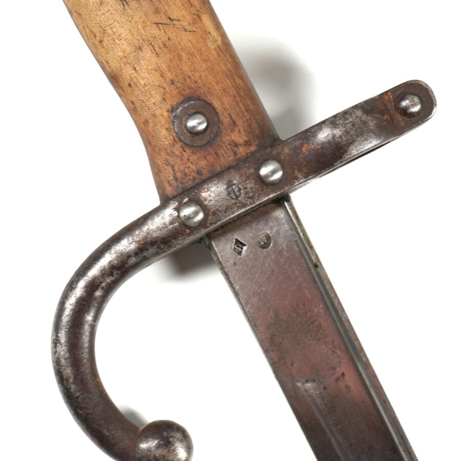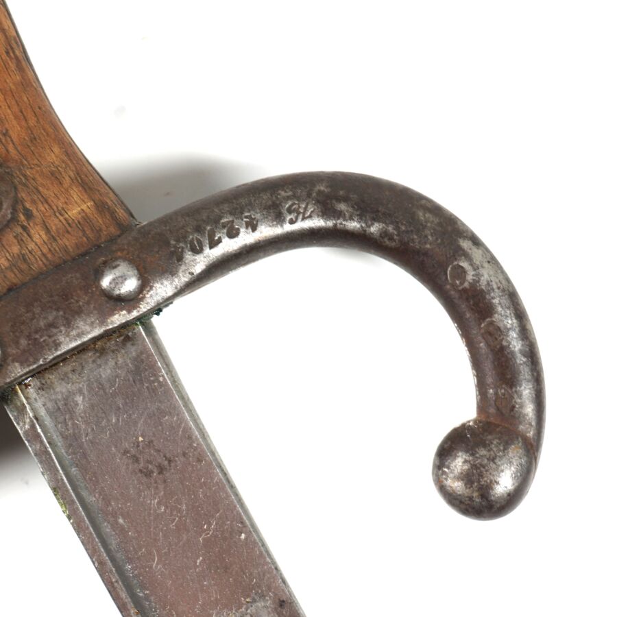 FRANCE - SABRE-BAIONNETTE MODELE 1874 DE MARINE dite GRAS, pommeau en laiton à bec, plaquettes de la poignée en bois, croisière en acier piqué à long quillon recourbé portant l'ancre de marine, lame droite à dos plat marquée " Mre d'Armes de St-Etienne Avril 1877 ", fourreau en acier au même numéro " H 42704 ", quelques piqures, BE.