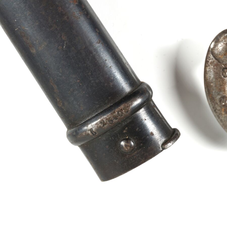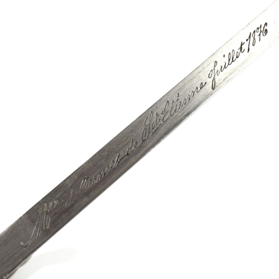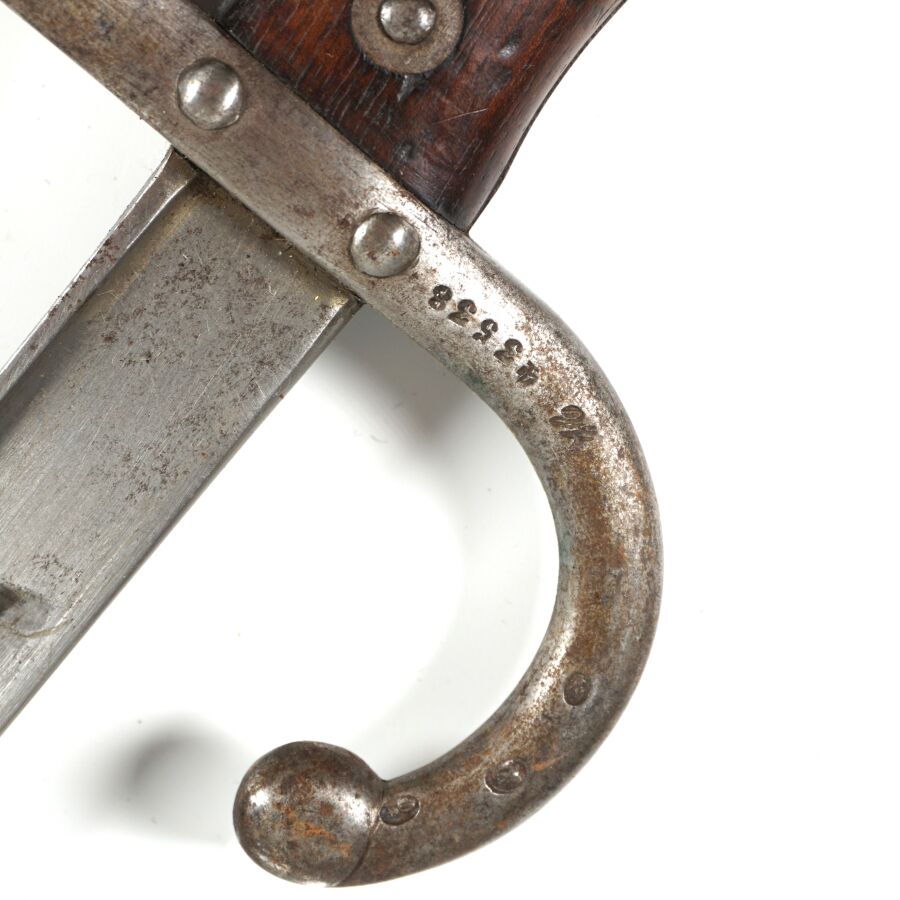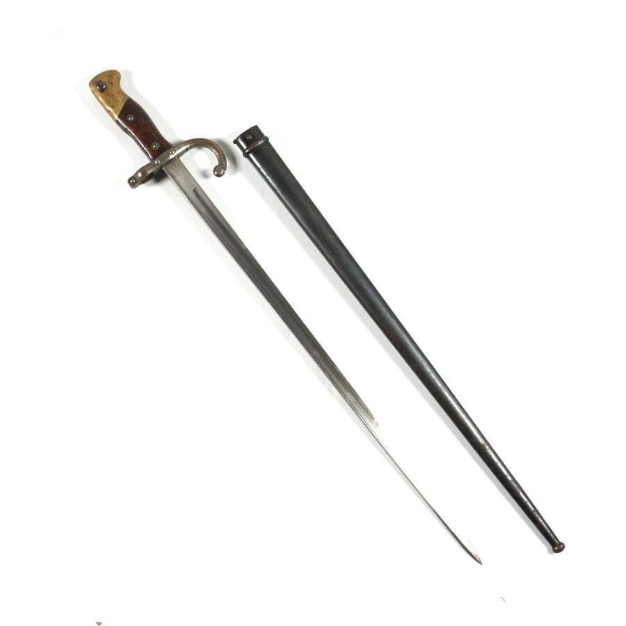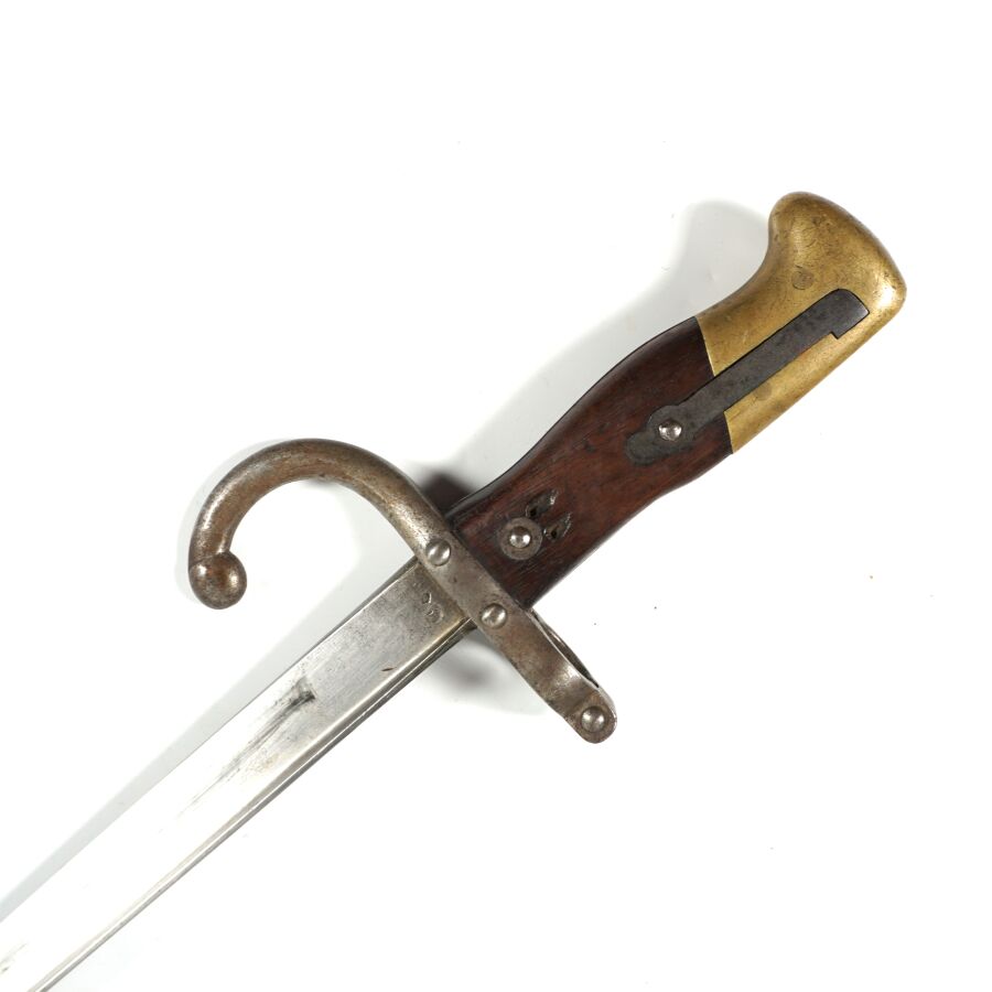 FRANCE - SABRE-BAIONNETTE MODELE 1874 dit GRAS, poignée à pommeau en laiton à bec, plaquette de la poignée en bois, croisière en acier à long quillon recourbé, lame droite à dos plat marquée " Mre d'Armes de St-Etienne juillet 1876 ", fourreau en acier bronzé noir, BE.