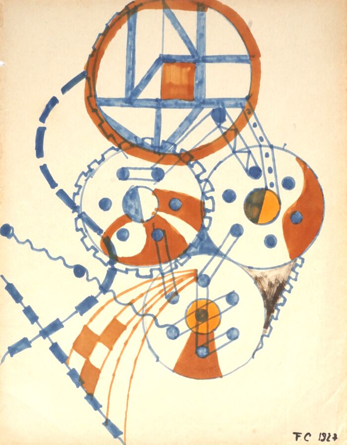 Franciska CLAUSEN (1899-1986), "Composition mécanique" 1927, dessin au feutre sur papier, signé du monogramme de l'artiste et daté en bas à droite, 27 x 21 cm (petite tâche et quelques déchirures en bordure).