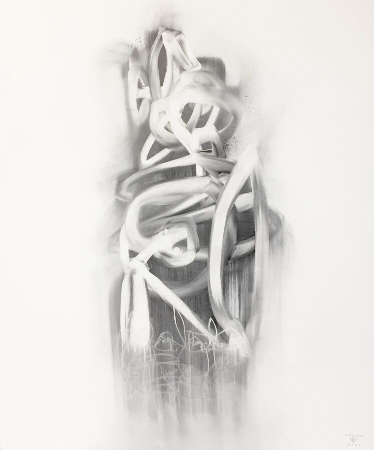 Franck LESIEUR (1975), "Horizon : Union du fini et de l'infini" 2021, fusain sur panneau de bois signé et daté en bas à droite, contresigné, titré et daté au dos, 65 x 54 cm.