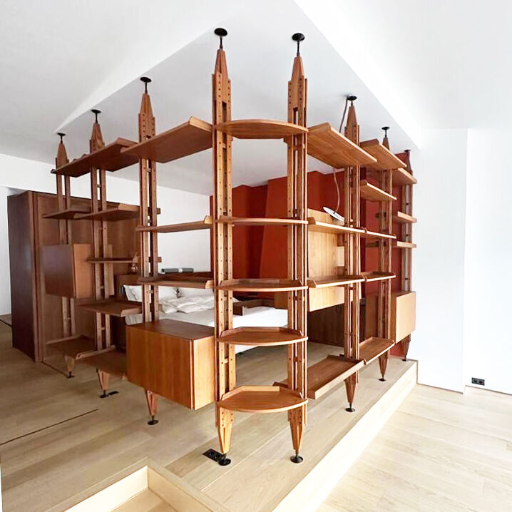 Cette bibliothèque modulable fait partie du système "Infinito", conçu par Franco Albini dans les années 1950 pour répondre à une idée novatrice du mobilier moderne : celle d'une structure aérienne et ajustable, adaptable aux différents volumes de l'habitat. Pensée comme une architecture intérieure à part entière, elle conjugue rigueur rationnelle et élégance italienne.