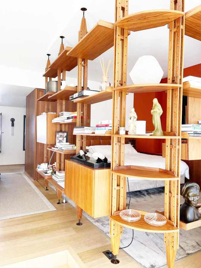 Les montants verticaux, réglables entre sol et plafond, permettent une organisation libre des caissons et tablettes, selon le principe de l'équilibre et de la transparence cher au designer.