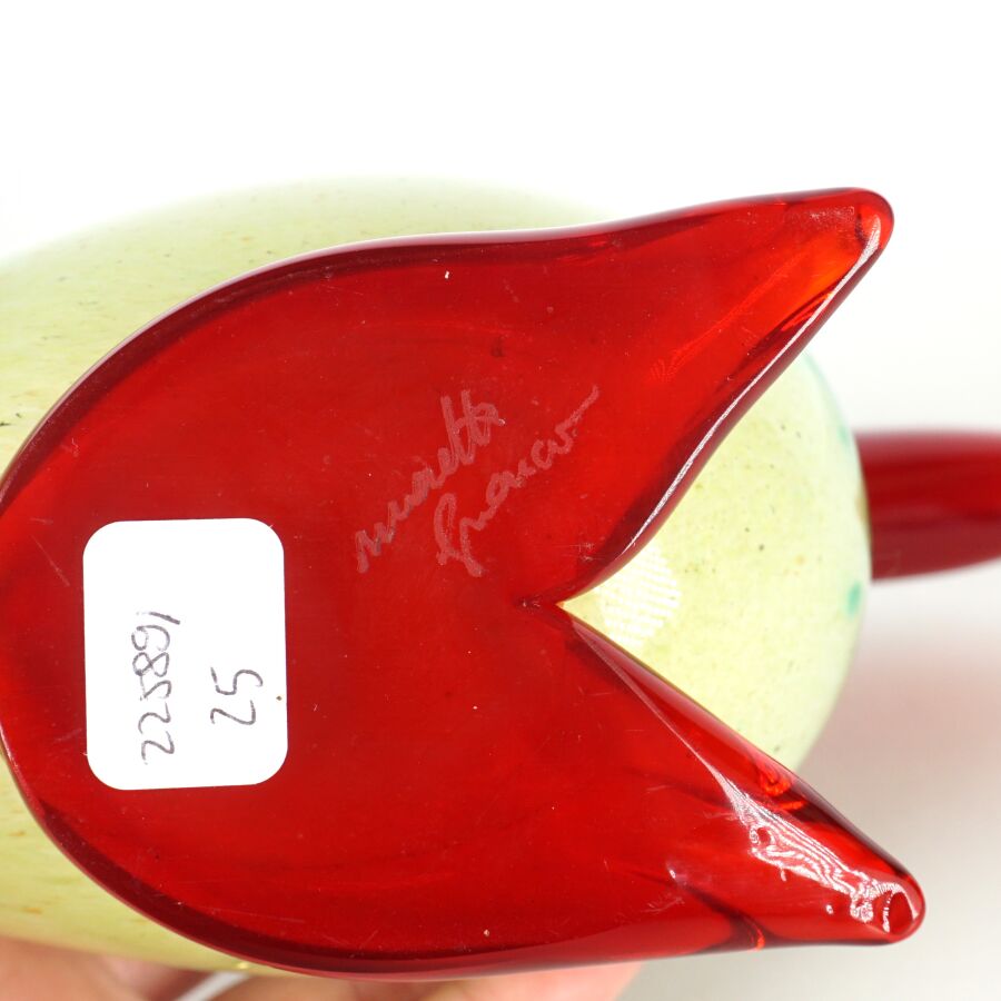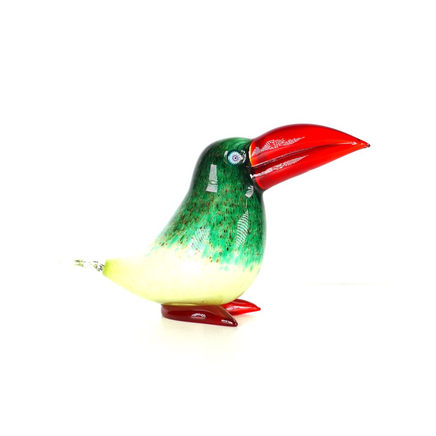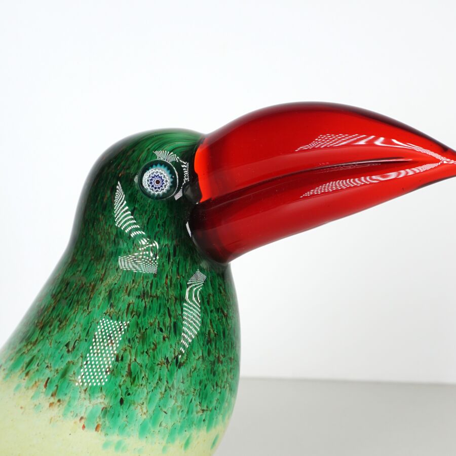 Franco MORETTI (1947), " Toucan ", sujet en verre soufflé rouge, vert et jaune et inclusions, les yeux sertis d'une perle de verre Millefiori, signé à la pointe dessous, H. 16.8 x 27 cm.