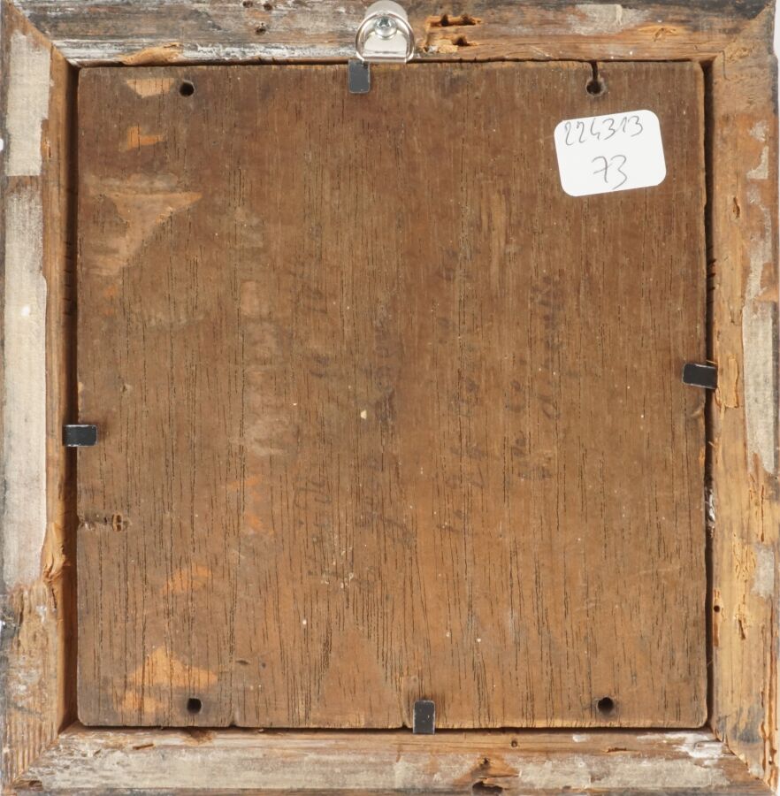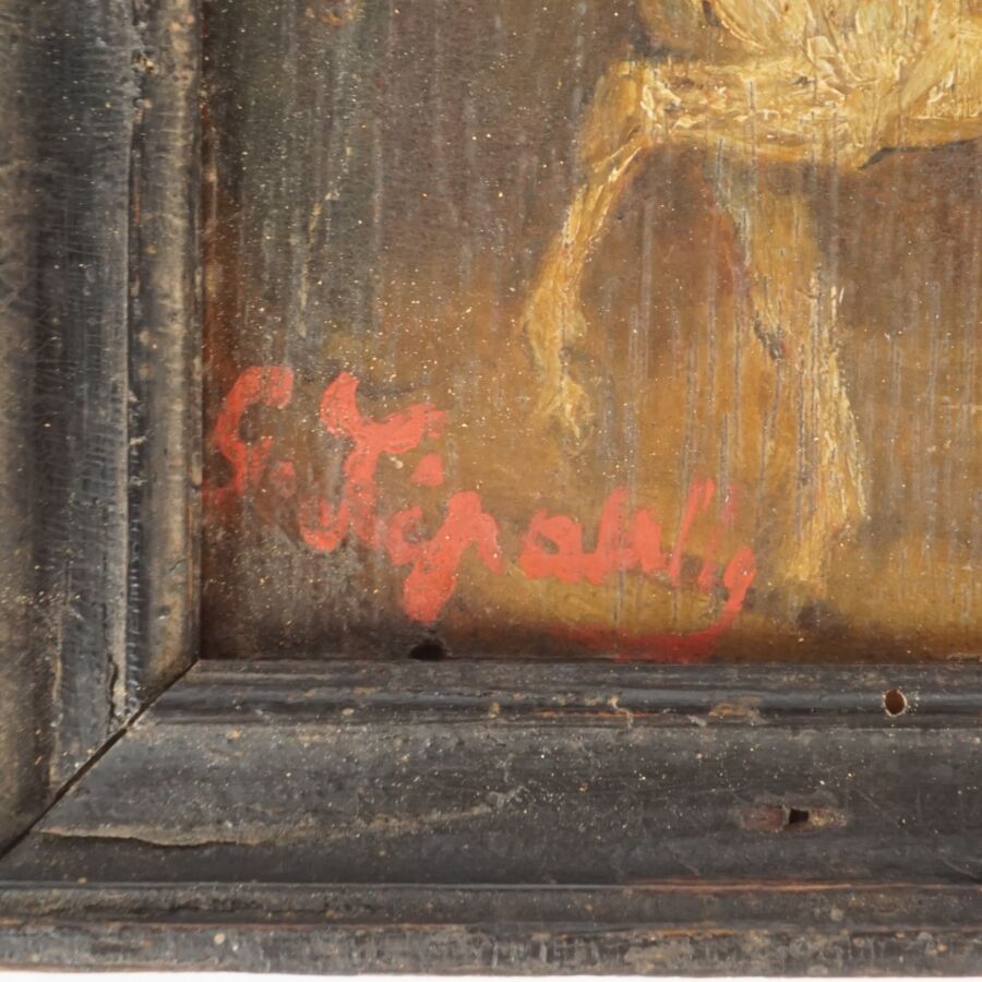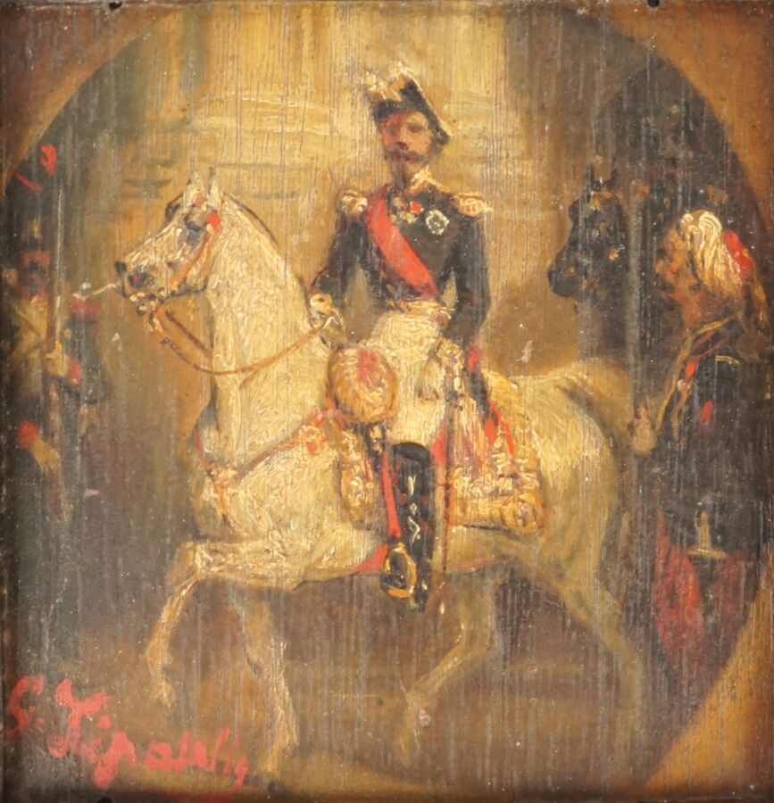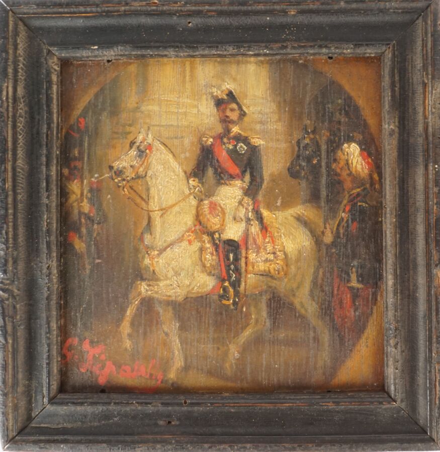 François Gabriel LEPAULLE (1804 - 1886), "Napoléon III à cheval", huile sur panneau signée en bas à gauche, gravé au dos "J'ai donné ce tableau à Jean Lebou (?) le 24 avril (18)94, veuve LEPAULLE", 13.2 x 14 cm (rayures, manques, trous aux angles).